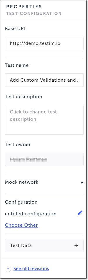 Hover over a test's Setup step (the first step) and click the Show properties (:fa-cog:) icon.