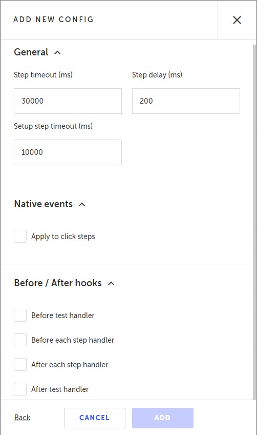 In the Native Events section, you can overwrite the default setting of how a click step will be handled with another setting just for this test configuration. By default, at the project level, the Click steps are configured to use either native or non-native events by default. Sometimes a test will fail because even though the “click step” passed, the click wasn’t actually executed. A possible solution is to try to configure the click steps in the test with the opposite configuration (i.e., instead of native, non-native and vice versa). Instead of changing the configuration for every click step individually, you can create a test configuration that overwrites the default native/non-native configuration and then simply run the test with this configuration to check if the opposite setting has fixed the problem. To overwrite the default Native events setting, select the Apply to click steps checkbox.