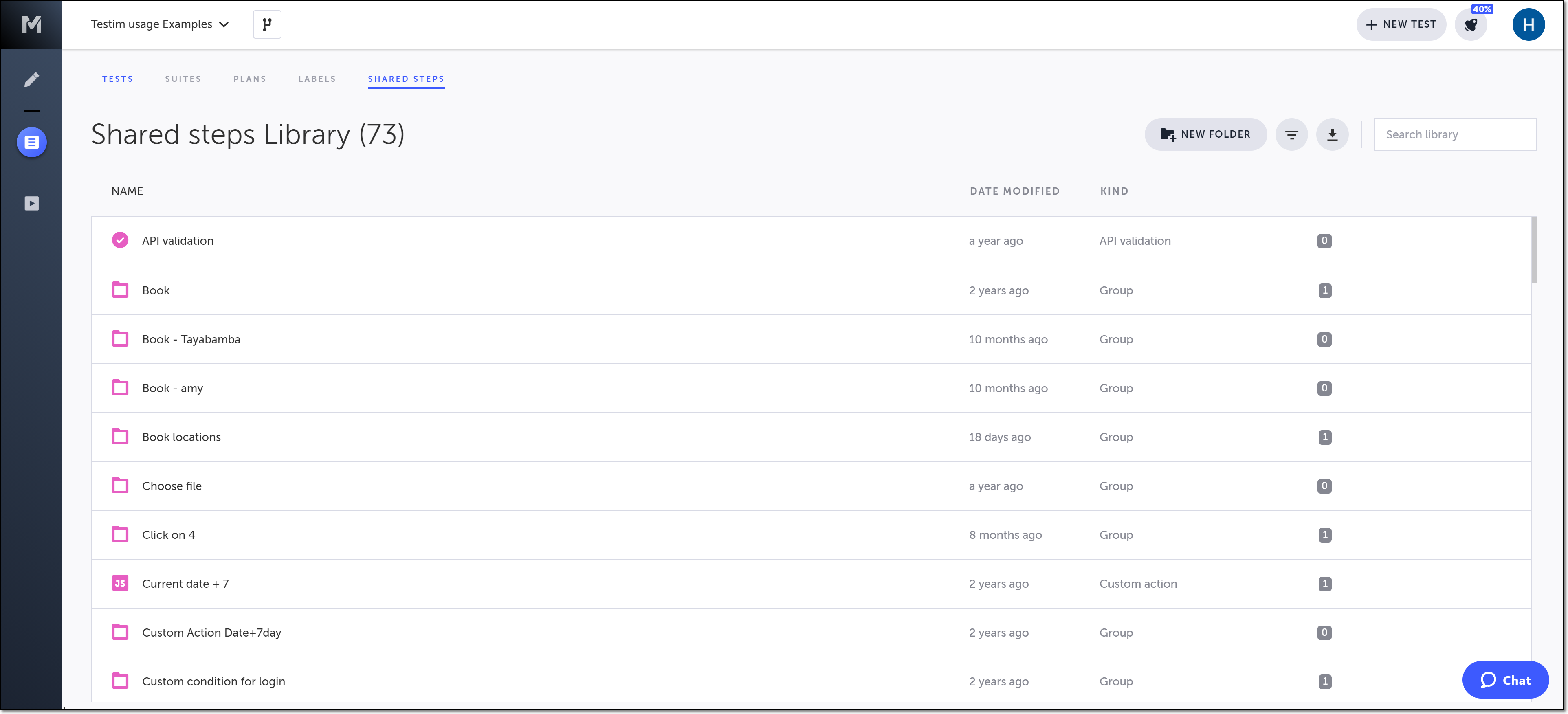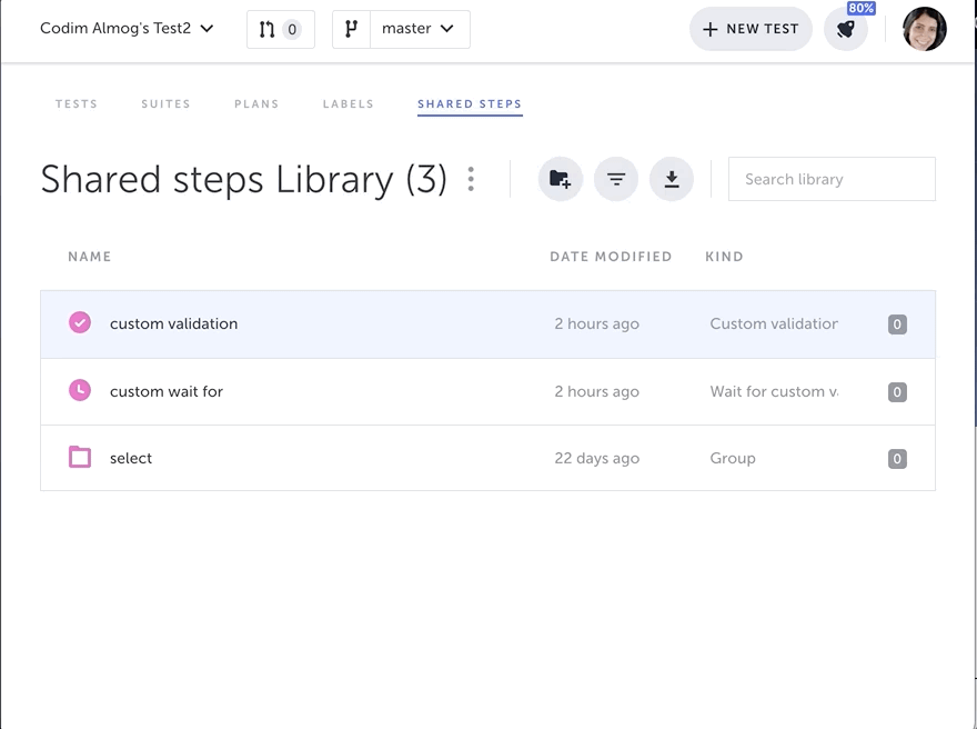 Kind - indicates whether the item is a shared step, group, or folder. If it is a shared step, the type of step will be listed (i.e. custom action, custom validation, etc.).