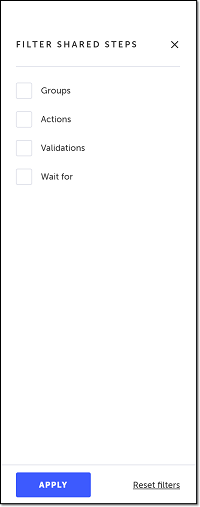 You can filter your shared steps by the step category (i.e. Groups, Actions, Validations, and Wait for).