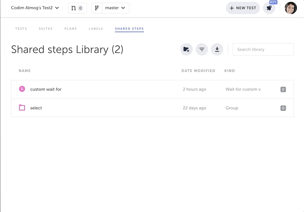 Used by - the number of tests using the shared step. (Clicking on the number will take you to the Test Library, filtered by this shared step.)