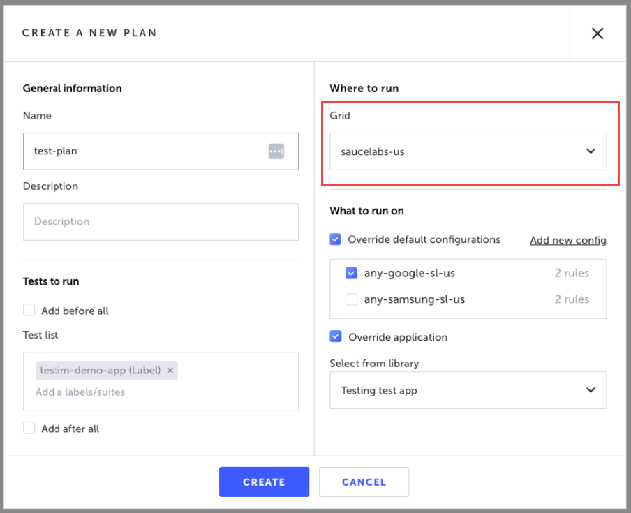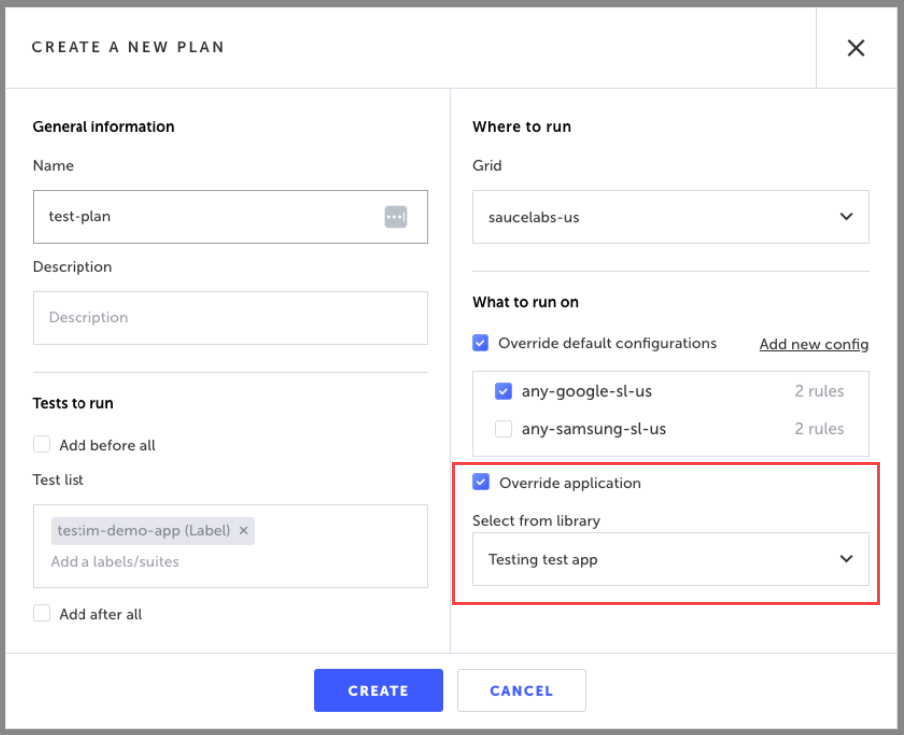 In the What to run on section, select the Override Application checkbox to override the default mobile app that was configured in the tests by a different application for your test plan.