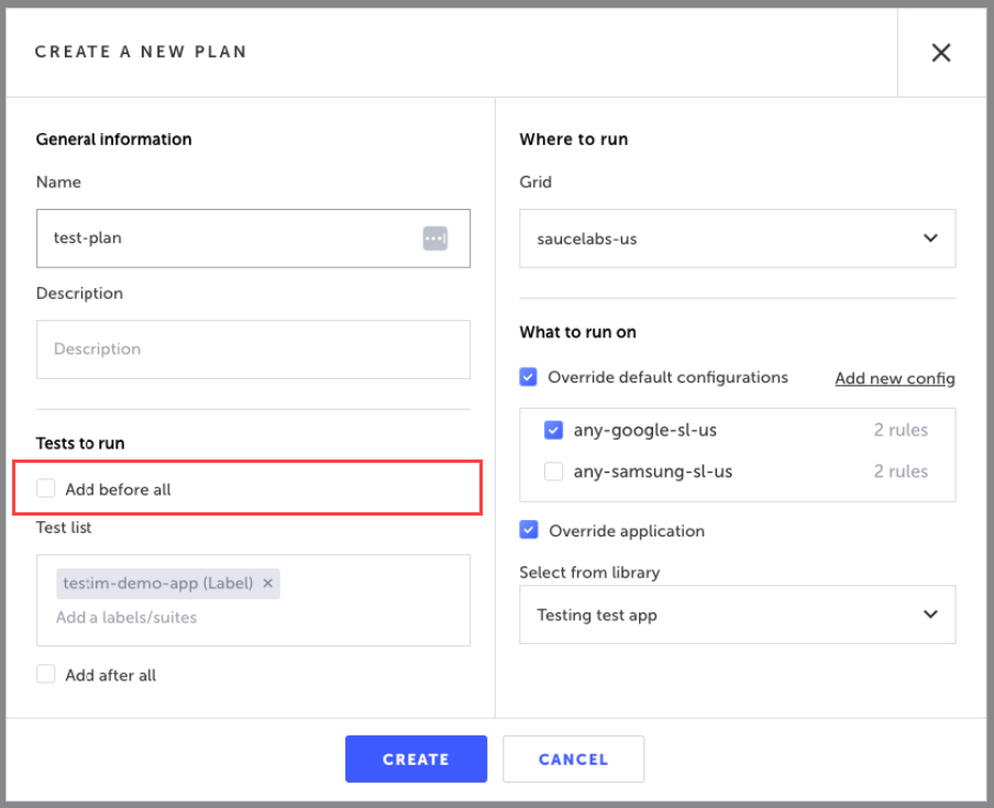 Select the Add Before All checkbox if you want to run a set of tests prior to Test Plan's main test list. Enter the name of one or more Test Suites or Test Labels. Typically this would include setup steps, such as login, etc.