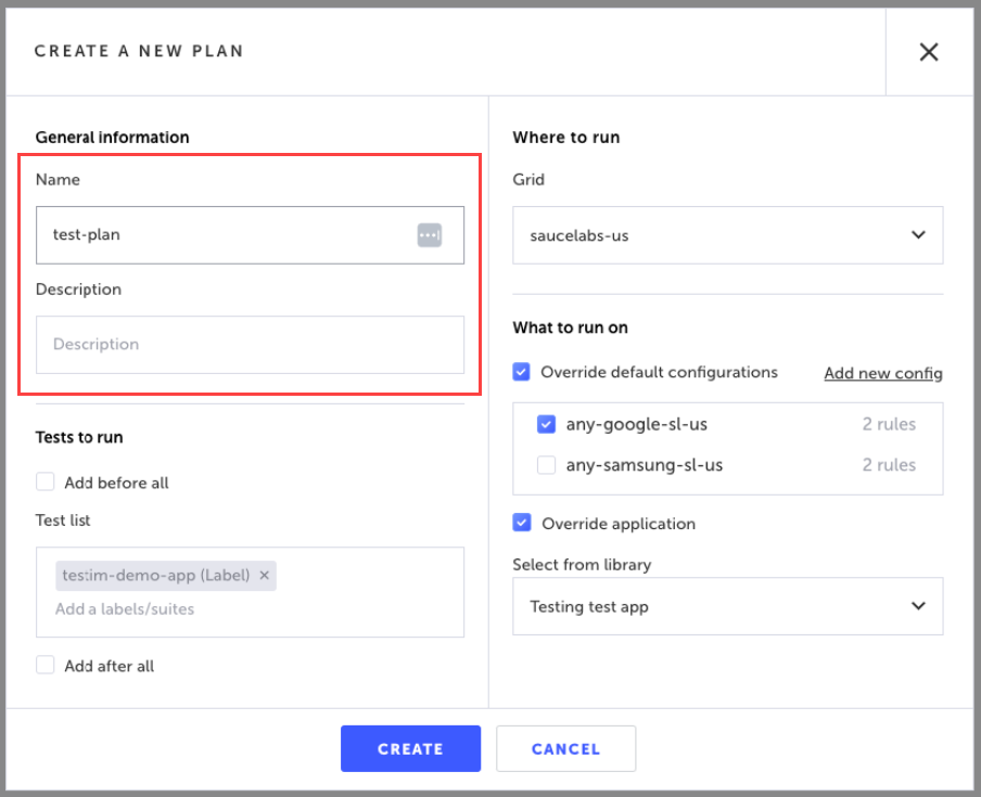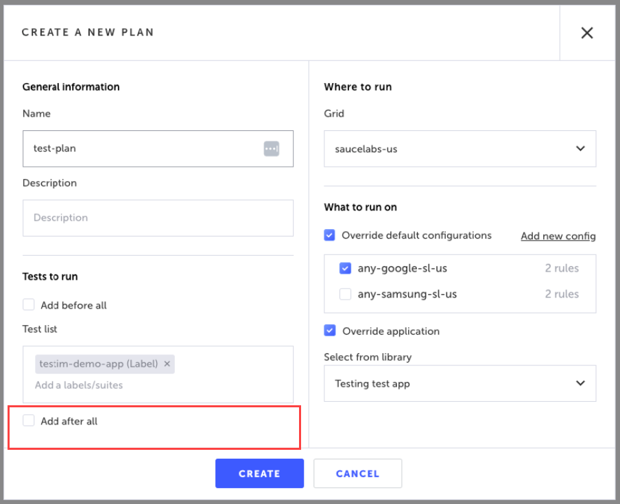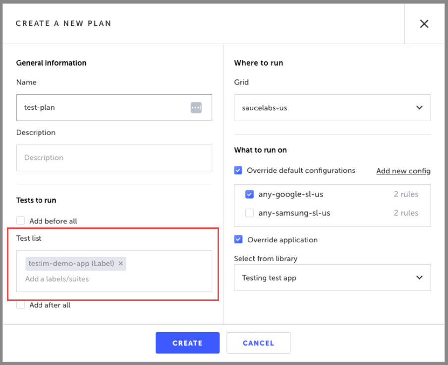 A test plan is a container of tests, which include specific test labels and/or test suites that can be organized to run consecutively. The test plan can include tests/test suites that run before and/or after the list of tests/test suites. The test plan can include settings that override the tests' default settings. Test plans are great If you need to do: