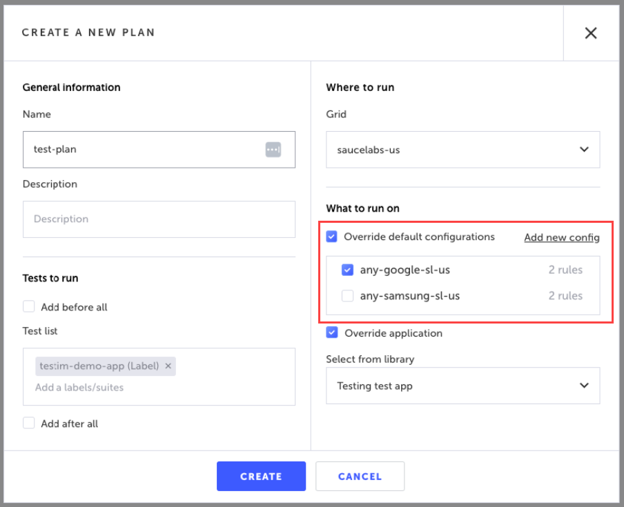 In the What to run on section, select the Override default configurations checkbox to override the default configurations of the tests with the selected configurations. Only configurations that are supported by the selected grid will be displayed. Choose from your list of configurations or create a new one. See Configurations Library for more information. Selecting multiple configurations will result in multiple executions, respectively. Each configuration will trigger an execution that will run a on a single device that is automatically selected from the grid.