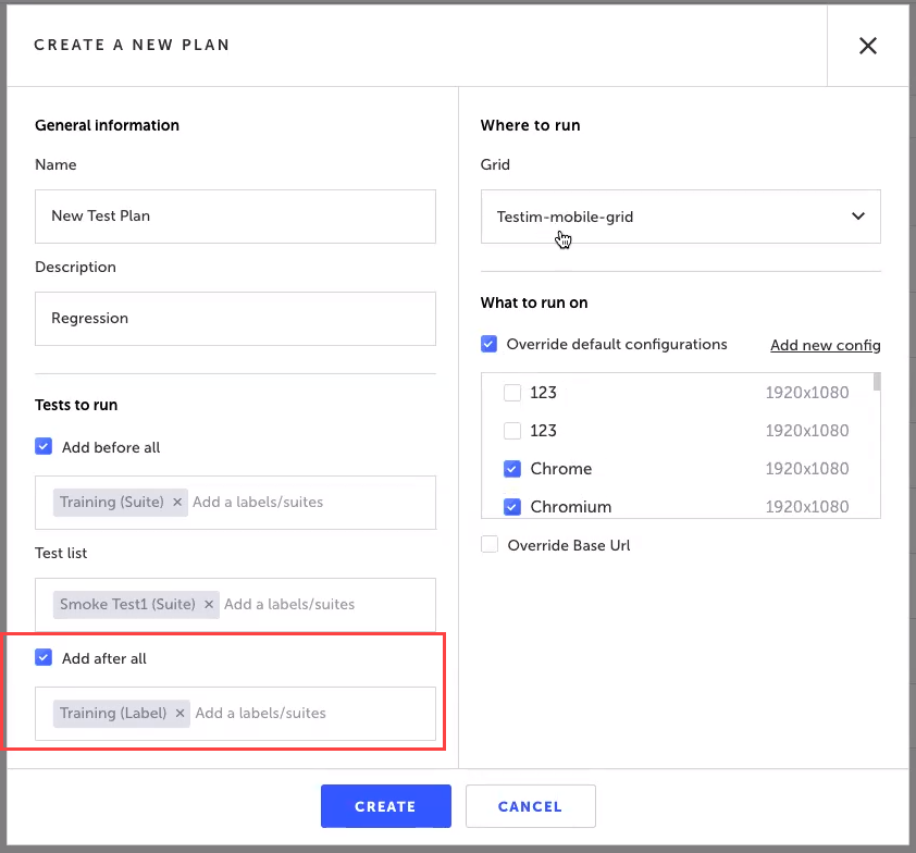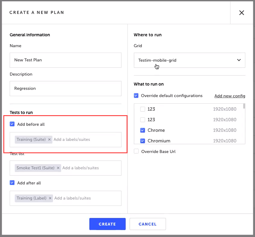A test plan is a container of tests, which include specific test labels and/or test suites that can be organized to run consecutively. The test plan can include tests/test suites that run before and/or after the list of tests/test suites. The test plan can include settings that override the tests' default settings. Test plans are great If you need to do: