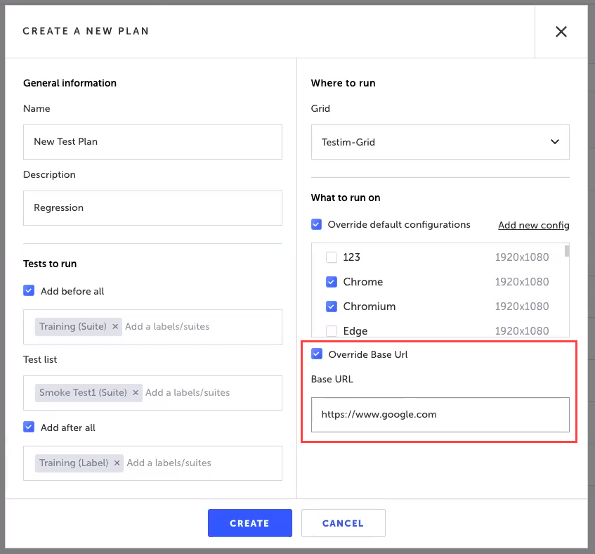 In the What to run on section, select the Override Base URL checkbox to set the start URL of your web app (e.g. production or staging environment). For more information, see Base URL.