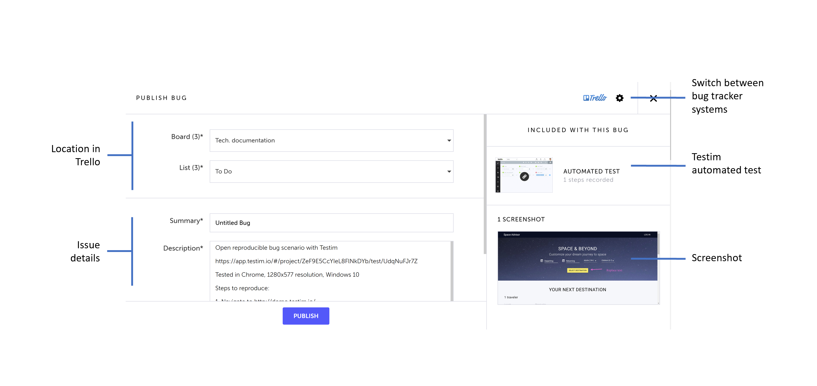 Depending on the bug tracker system that you connected to, you will see a different form to fill out with the bug information. Fill out the form based on the description below and then click Publish.