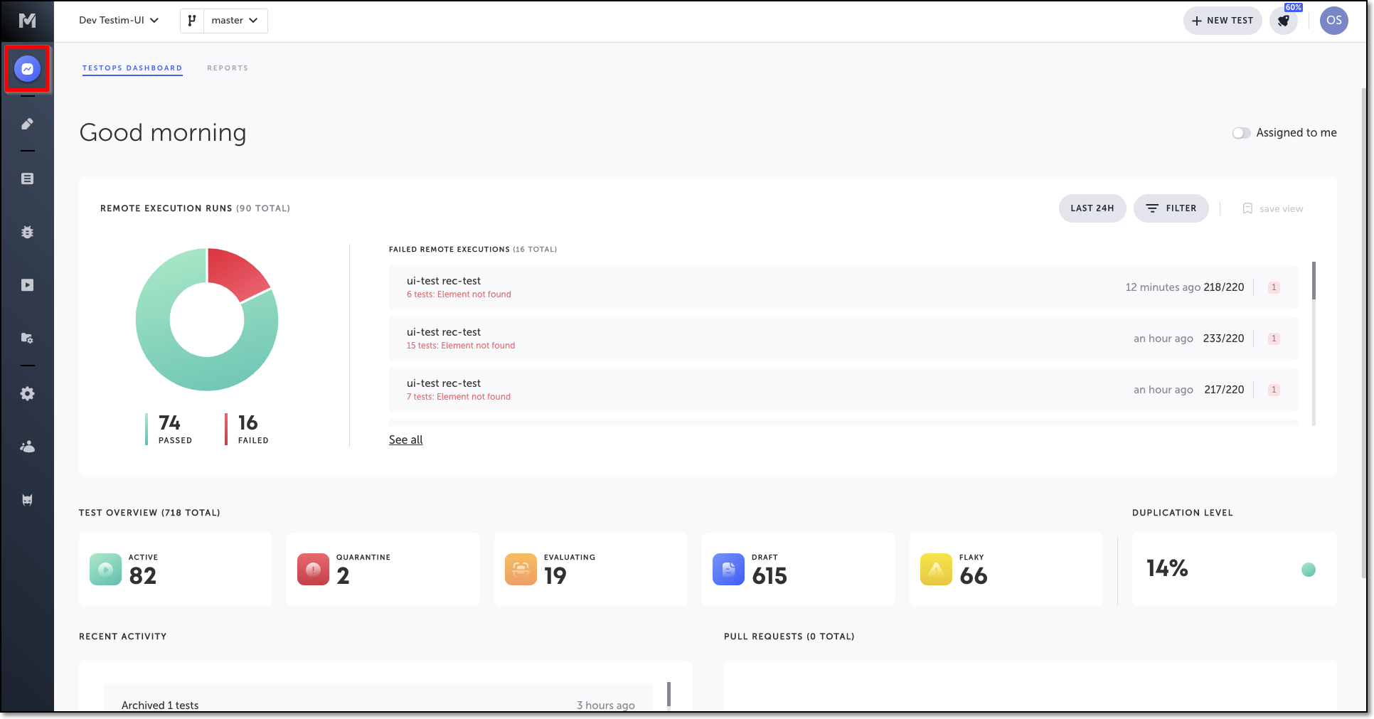 TestOps Dashboard – The TestOps Dashboard provides important statistics with quick access to tests, remote execution runs, and other activities in your project. For more information, see TestOps Dashboard.