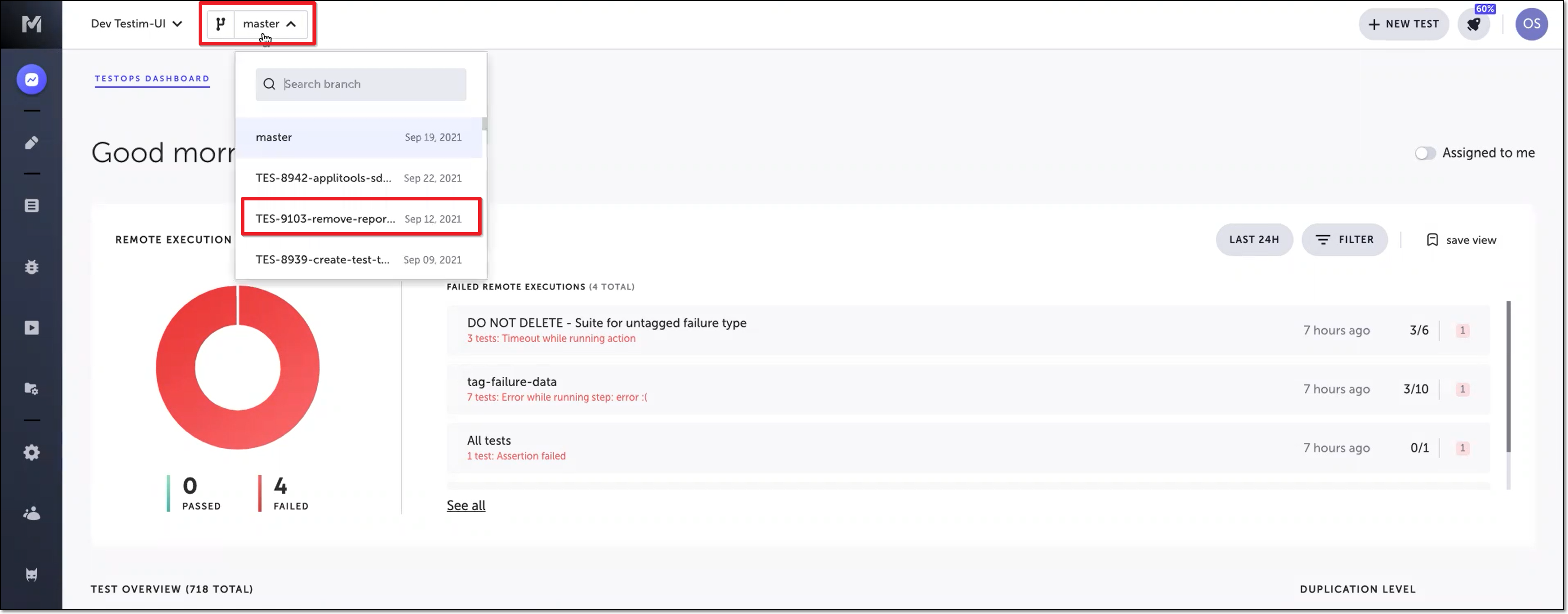 The Insights section displays the information that is relevant to the specific branch that is currently selected. You can select any branch of your project, and the information shown is adjusted to reflect the data specific to that branch. You can also pin a branch so it becomes the default branch. This means that every time you log into Testim (until you remove the pin), the selected branch will be the pinned branch, and the data shown in the Insights section will be the data stored in this branch. For more information, see Pinning a Branch. → To select a branch of your project: