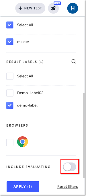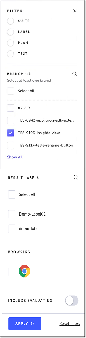 You can filter the data shown in the results by execution run type (suite, plan, scheduler, label, and test), branch, result label, and browser. By default, the data included in the results does not include test runs that have the test status of evaluating; however, you can include these test runs by sliding the Include Evaluating toggle in the Filter settings to the right. For more information on test status, see Test Status. For more information on result labels, see Result labels.