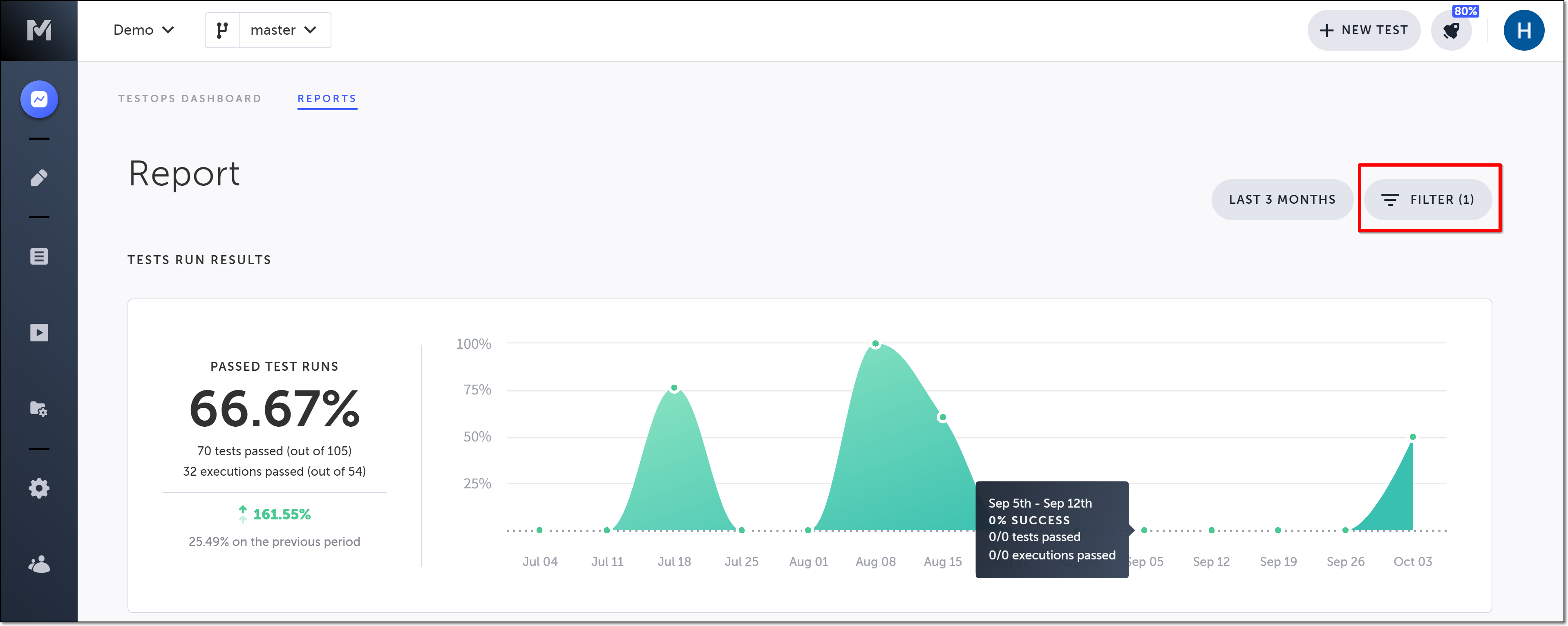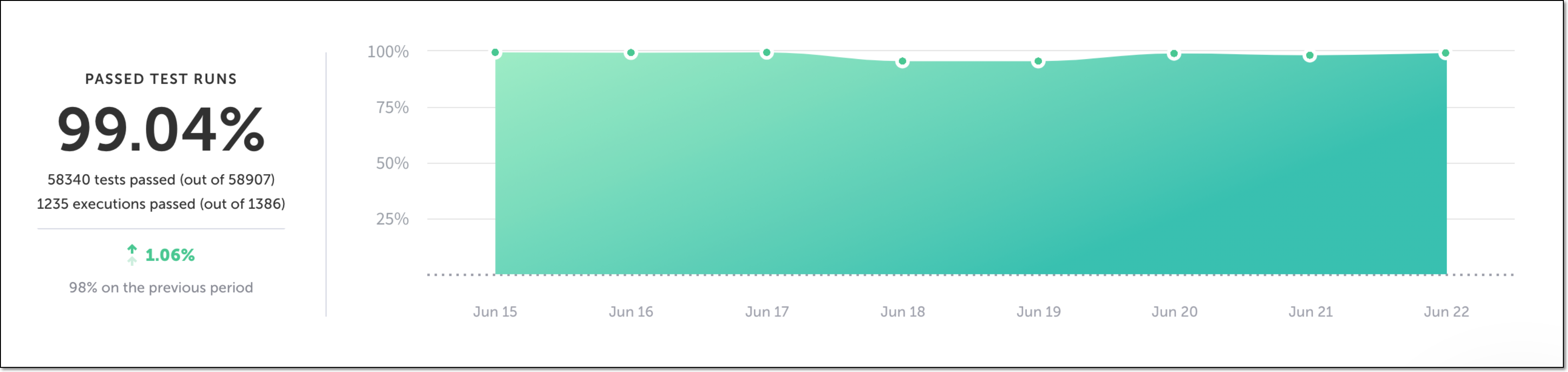 The right side of this pane contains a graph showing the percentage of test runs that passed during the selected time period. Hover over a specific date to see detailed information about the test runs that passed on that date.