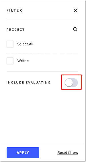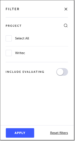 You can filter company-level reports by project. By default, the data included in the report does not include tests that have the test status of evaluating. There is an option in the filter settings to include the data from these tests.