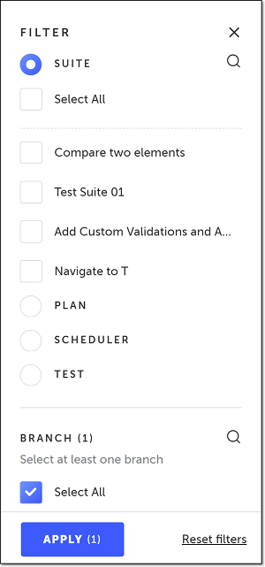 The Filter pane opens on the right-hand side, showing the execution run types you can filter by (Suite, Plan, Scheduler, Label, and Test) and the Branch, Result Labels, and Browsers you can filter by. ( Only the options that are relevant for the chosen time frame are shown.The Result Labels shown are based on the terms you have previously used to label your results. For more information, see Result labels.)
