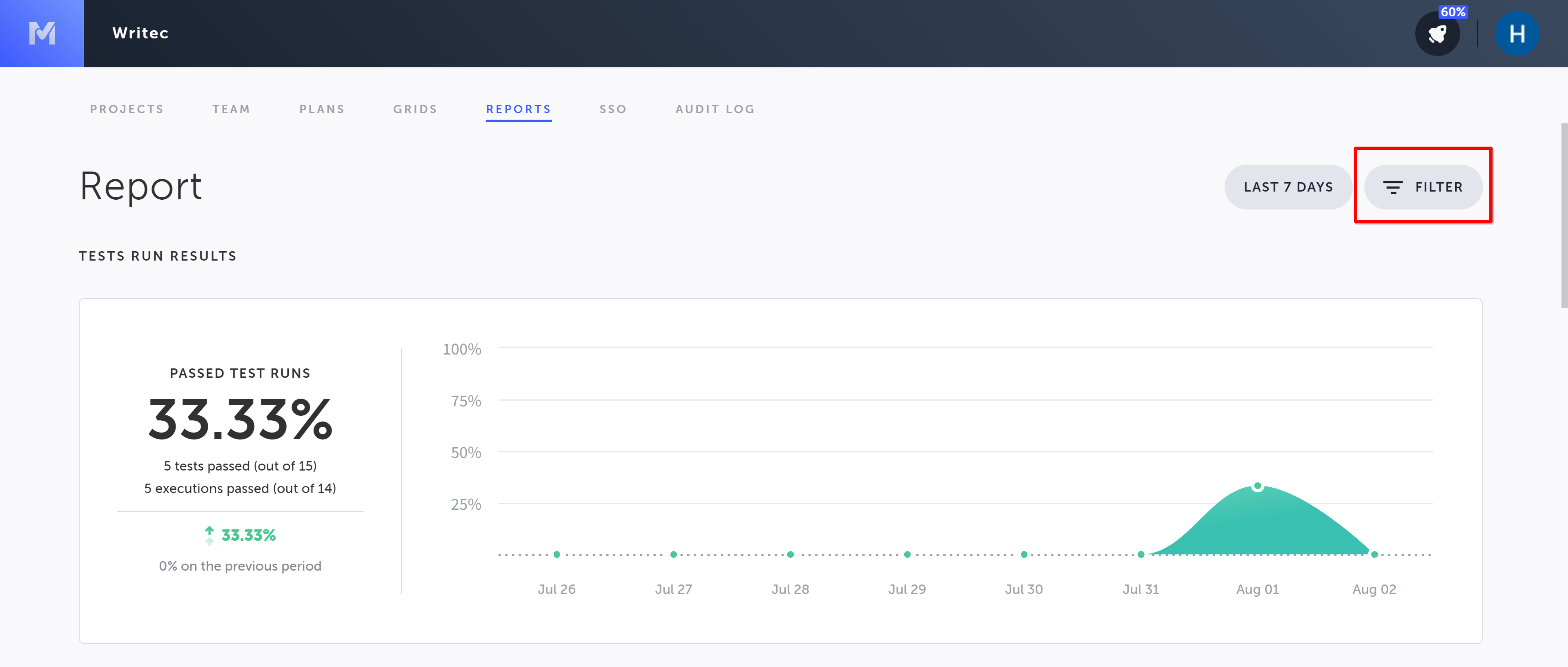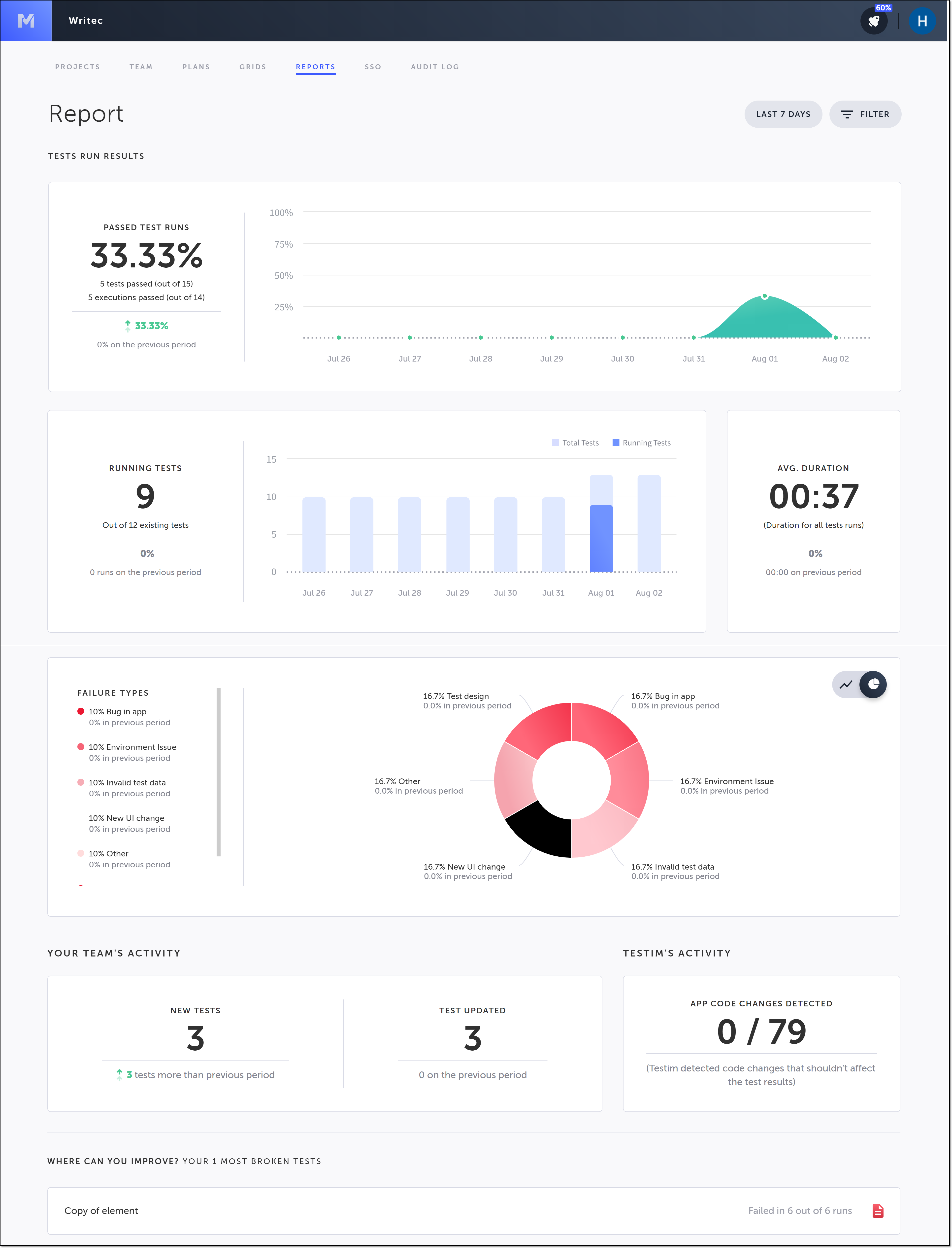 You can select the reporting time period by using the dropdown menu in the top right corner of the page. Options are: Today, Yesterday, Last 7 Days (default), Last 30 Days, Last 3 Months, and Custom. You can also filter your results. The following users will receive a "Testim weekly report" summary via email: