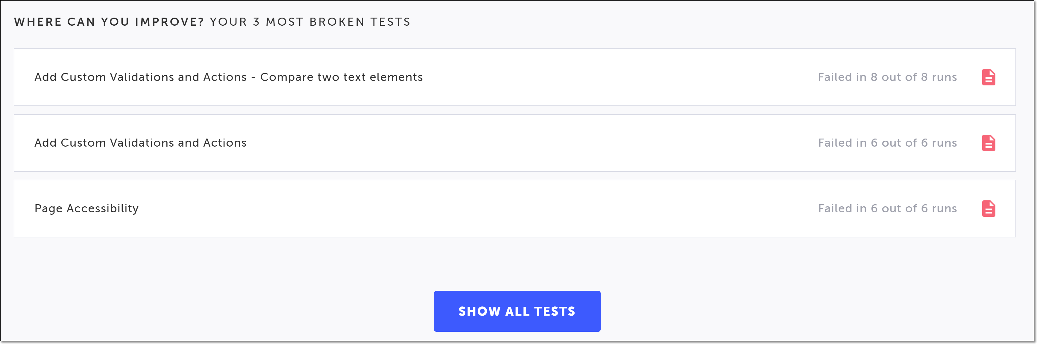 Where Can You Improve? – shows information about the three tests that have failed the most during the selected time period.