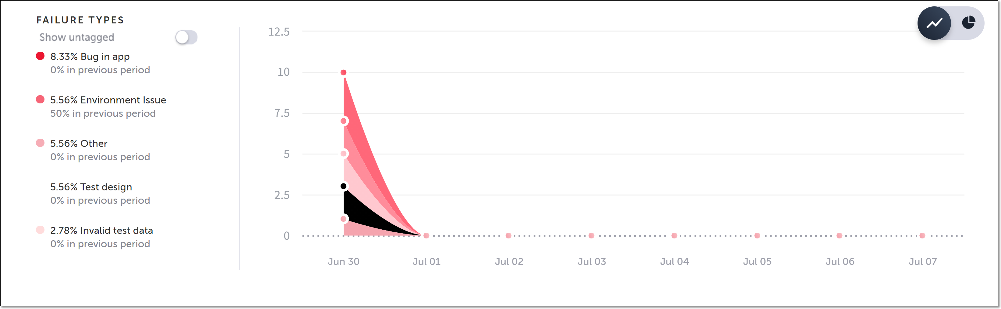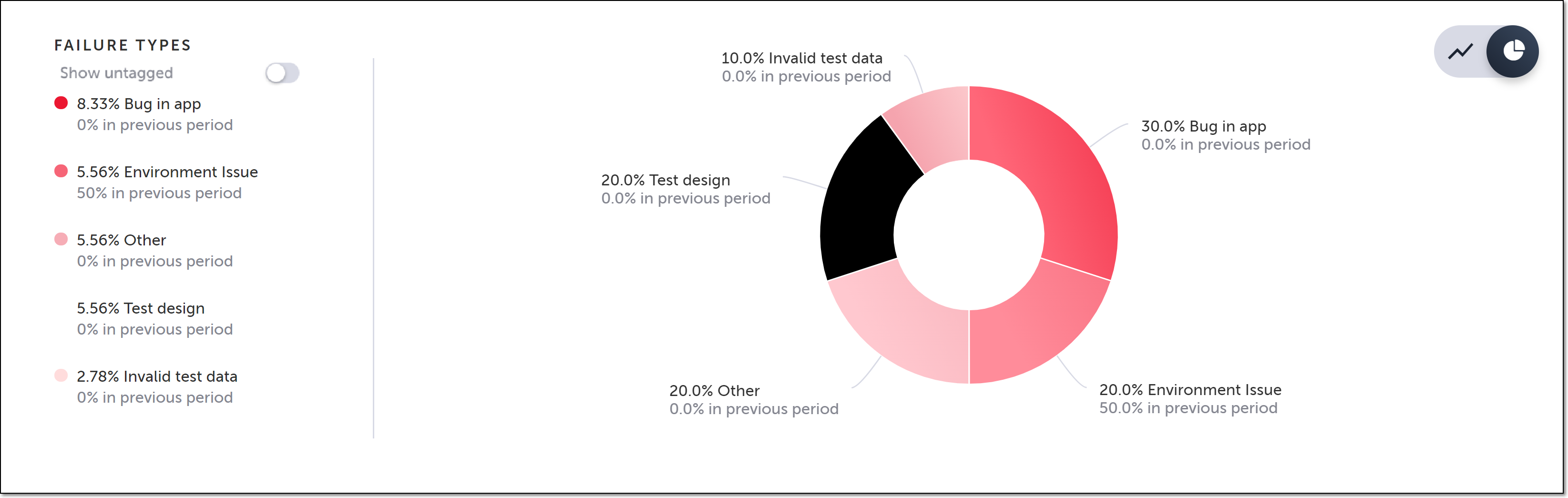 The left side of this pane shows the percentage for each of the failure types that you tagged your failed tests with during the selected time period. It also shows the percentage for the previous time period. By default, only tests that you tagged are included in these figures. To see the entire failed distribution, click the Show untagged toggle. The right side of this pane contains a chart showing the distribution of how you tagged your failed test runs during the selected time period. You can toggle the view between a donut chart (default) and line chart by clicking on the corresponding button in the top right corner of the pane. When the view is in line chart mode, you can hover over a specific date to see the number of failed tests assigned to each failure type on that date. For more information about failure tagging, see Tagging failed runs with failure types.