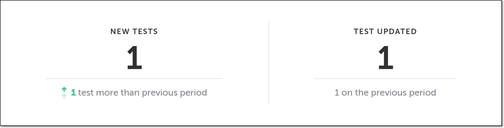 This section contains one pane showing info about your team’s activity during the selected time period. The left side of the pane shows the number of new tests created by your team during the selected time period, and the change in the number of new tests created compared to the previous time period. The right side of the pane shows the number of tests updated by your team during the selected time period, and the number of tests updated by your team during the previous time period.