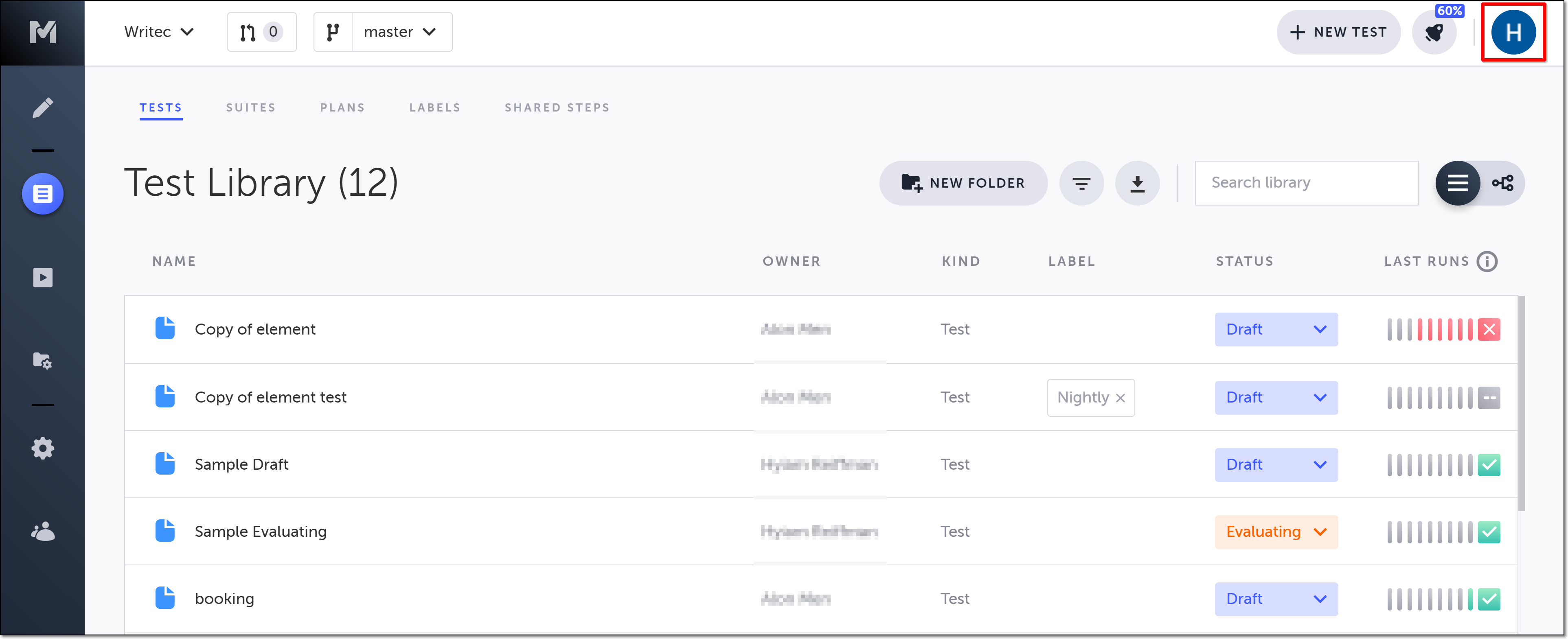 Testim’s Activity – shows information about the number of times Testim’s locators were used to identify a modified element in your runs.