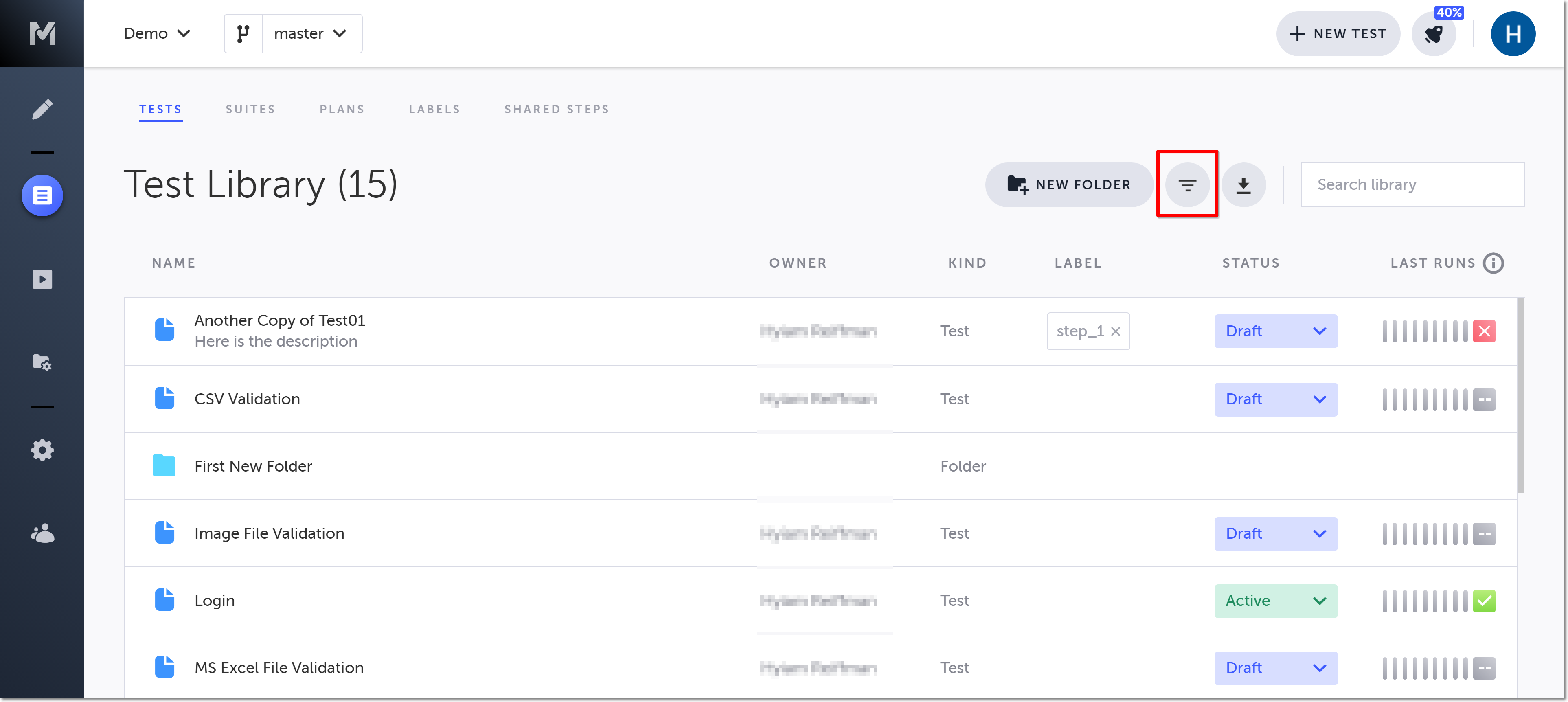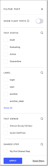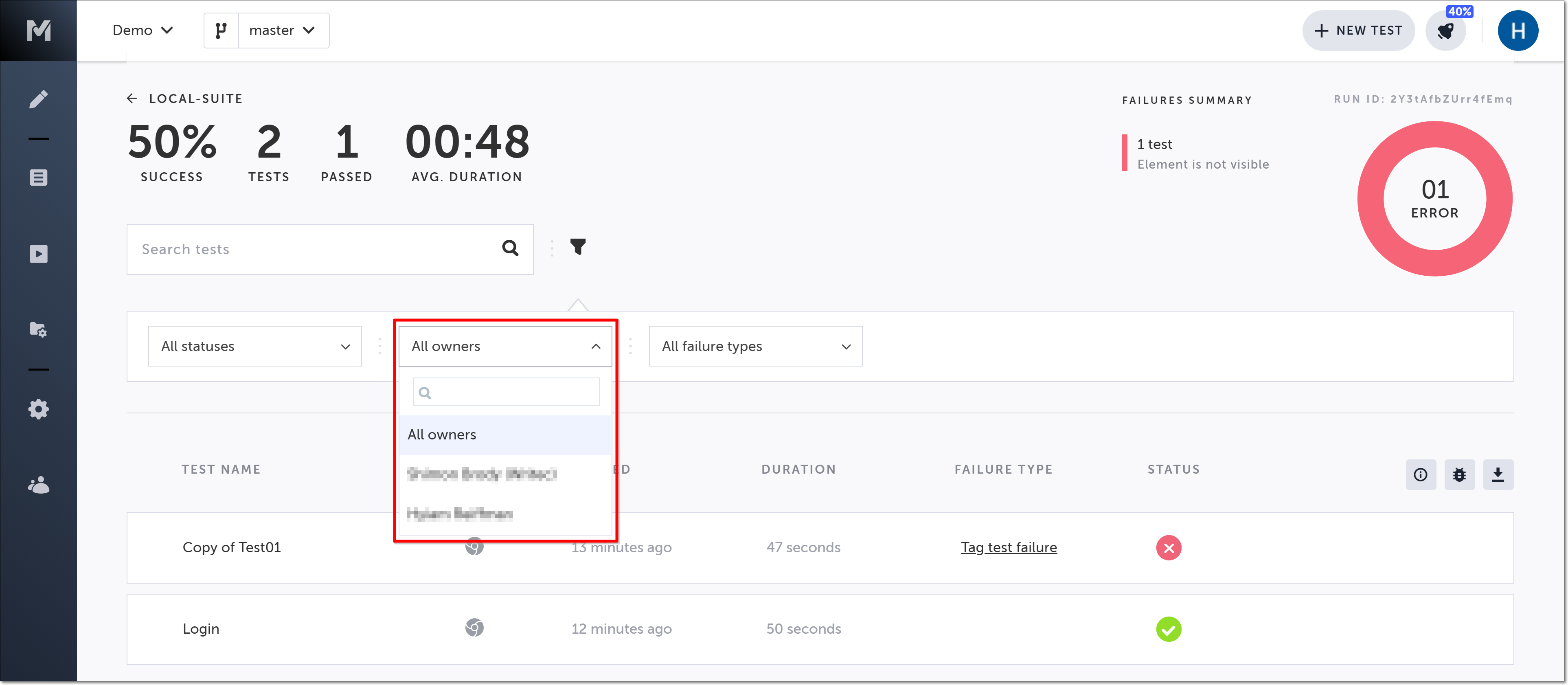 You can filter your list of tests in the Test Library by one or more test owner(s), and your list of tests in a Suite Run by a single test owner.