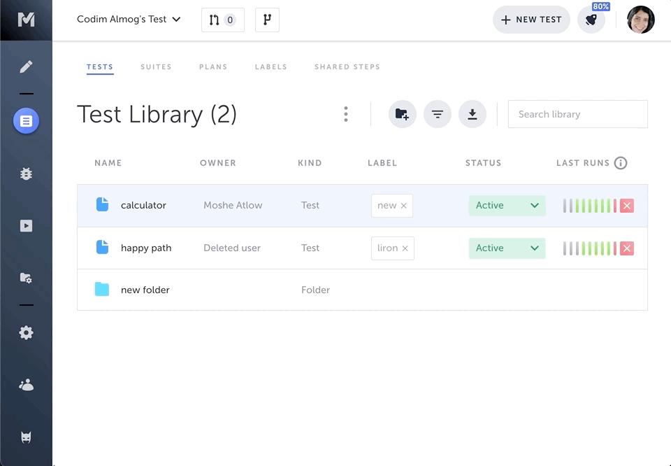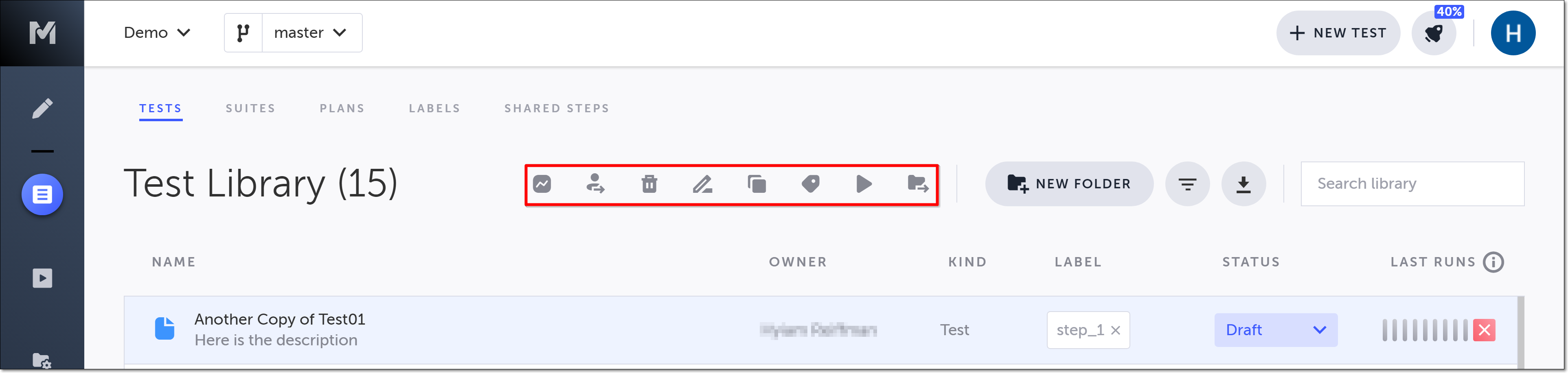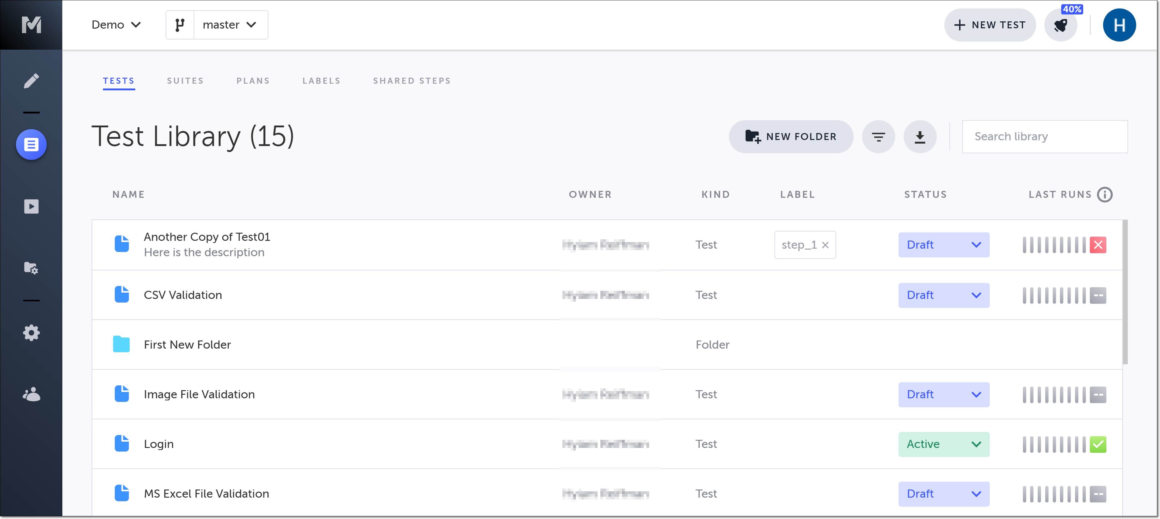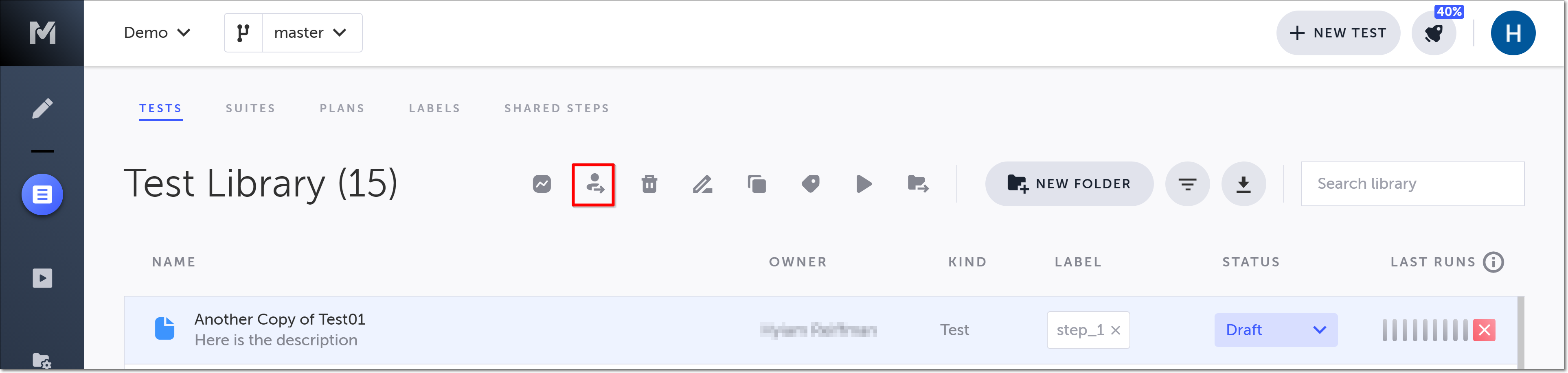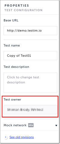 The Test Owner feature enables you to designate the “owner” for each test. This is helpful for identifying the person responsible for the test, as well as for filtering the test library and suite run results by test owner(s). By default, the initial test owner is the author of the test. You can reassign the test to a new owner.