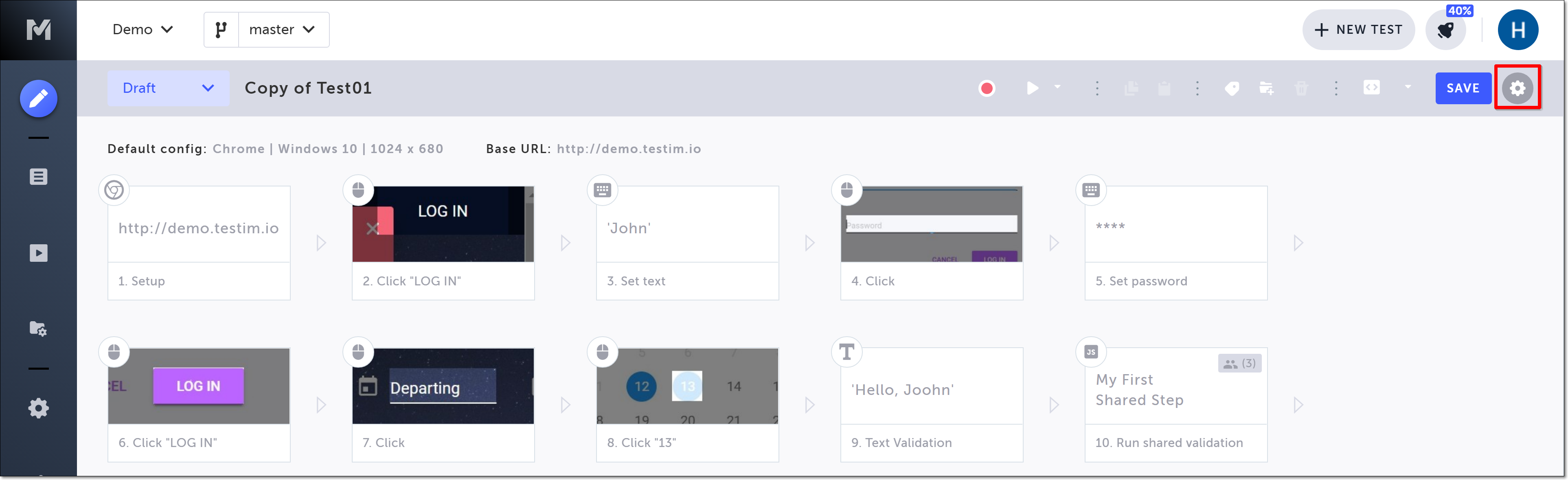 Alternatively, hover over the initial step of the test, and click on the Show properties (:fa-cog:) icon.