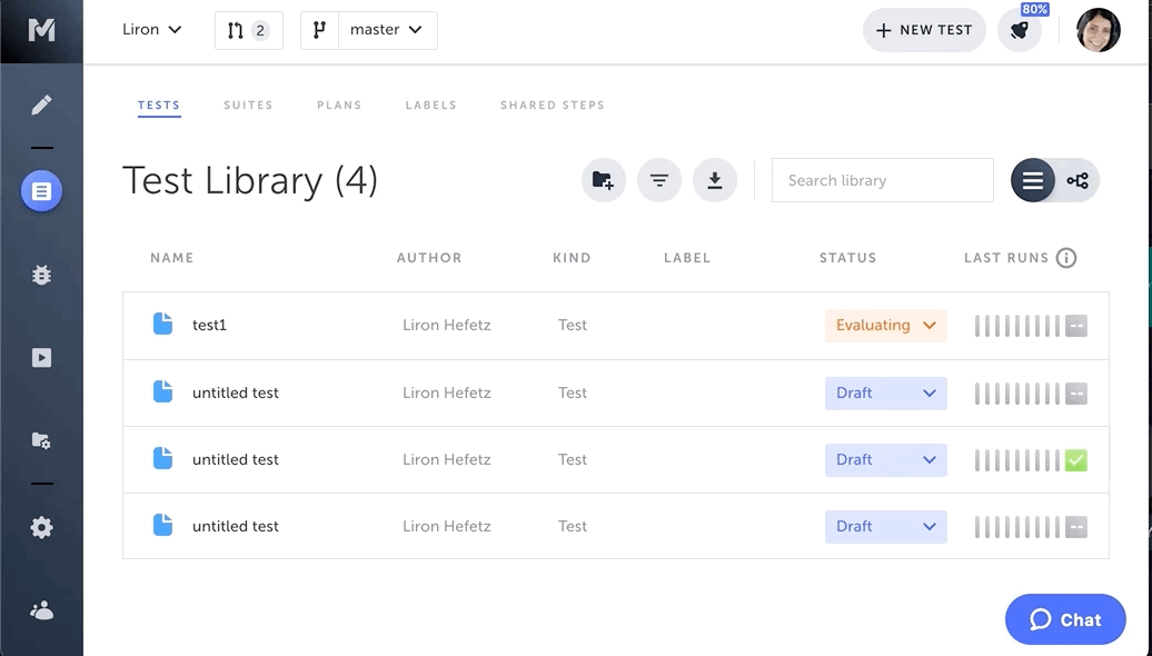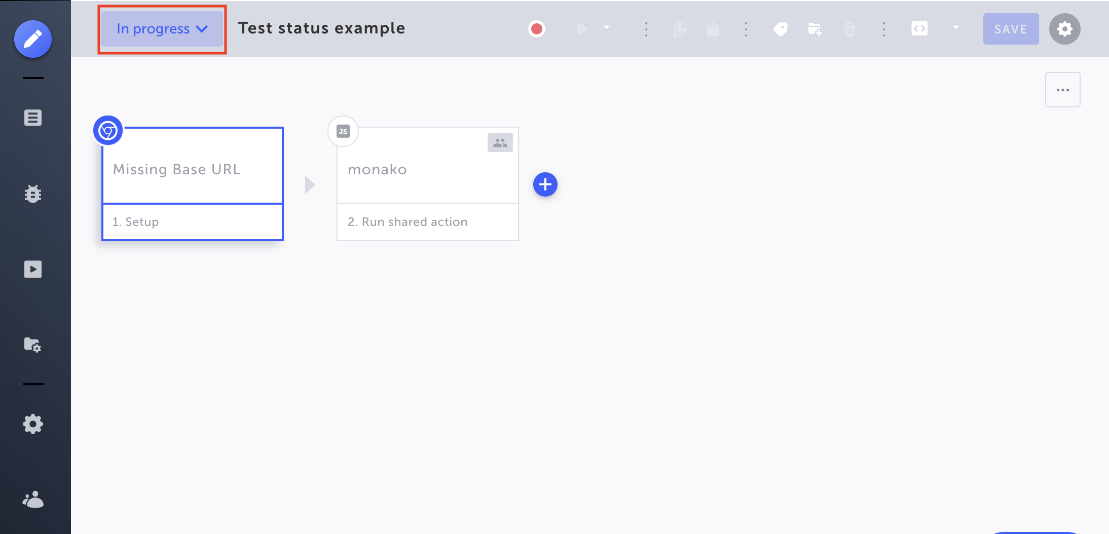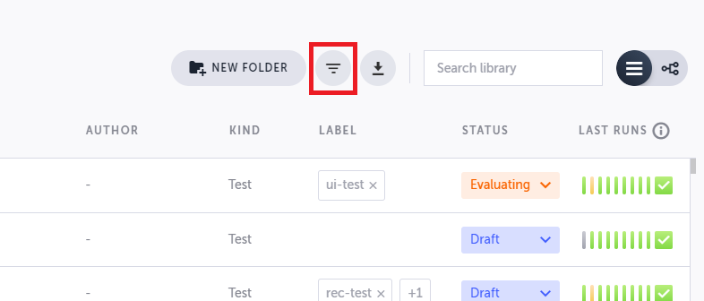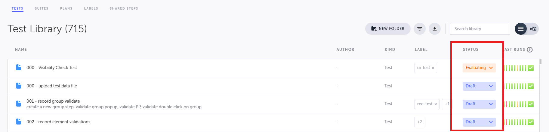 You can add a status to your tests to help manage which test needs to be worked on. The statuses are displayed as one of the columns in the Test Library list and in the Test Editor. By default all statuses are labeled as "Draft". After the feature is enabled, Testim automatically identifies tests that were run in the last 30 days and labels them as "Active". All other statuses are applied manually, as described below. By manually managing the tests' statuses you can enjoy the following benefits: