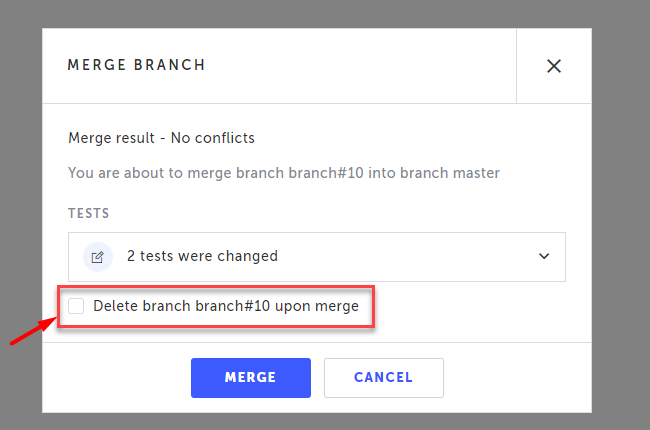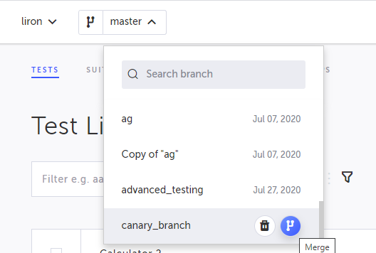 Merging two branches will mix steps or add entire tests from the selected branch into the currently displayed branch, which can be the master branch or any other branch. After the merge the source branch will still exist until you specifically delete it. In the case of a conflict, you will be able to review the conflicted steps and decide which of the conflicting steps to take. → To merge two branches: