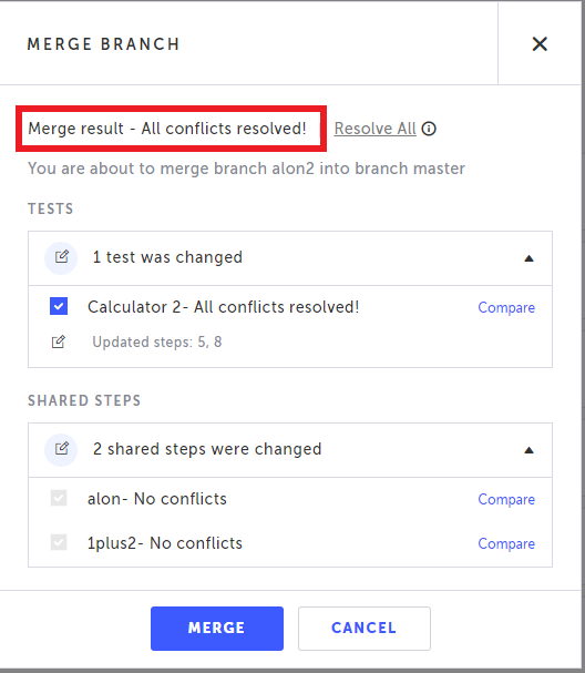 If there are no conflicts at the test level, when done resolving all the remaining conflicts on all the shared steps, click Merge. All the shared steps from the selected branch will be merged into the currently displayed branch, which can be the master branch or any other branch.