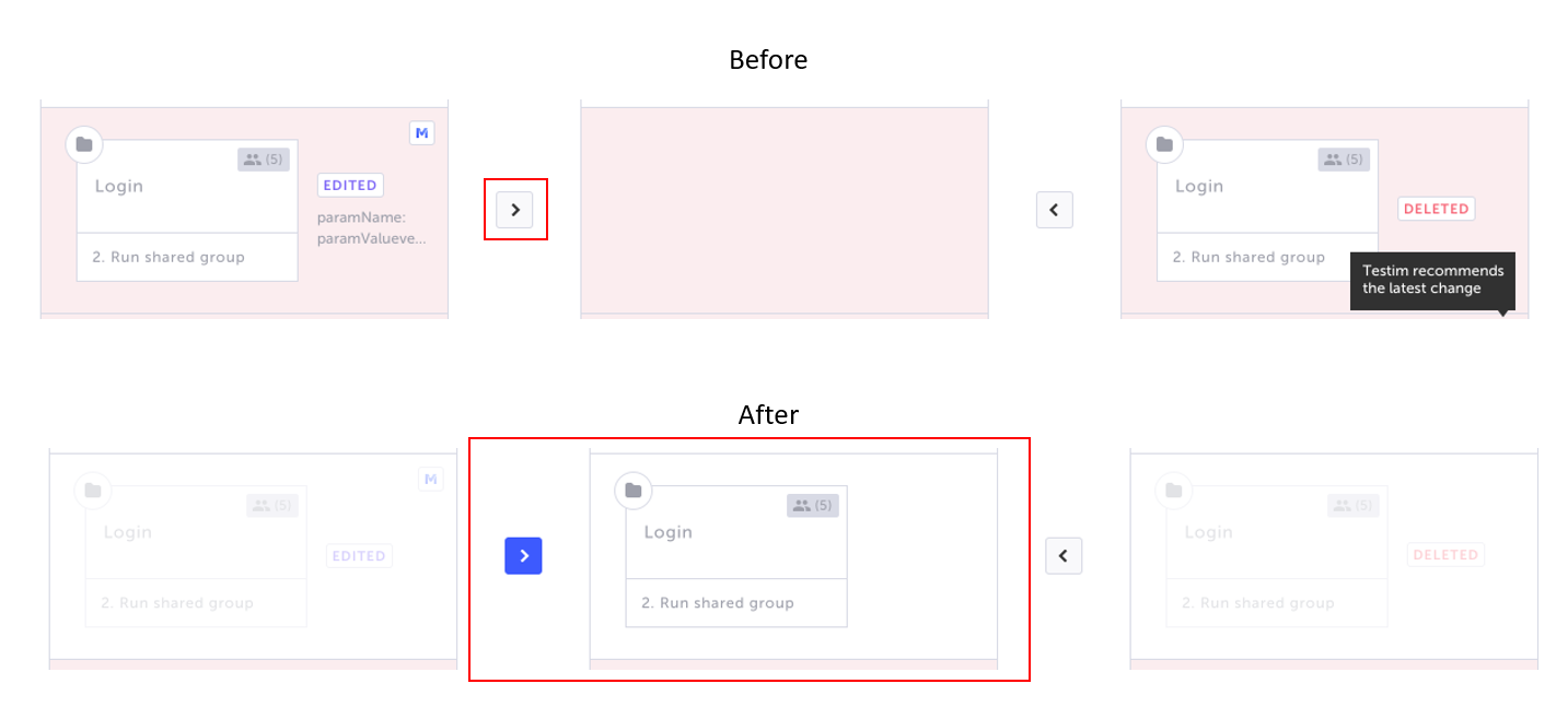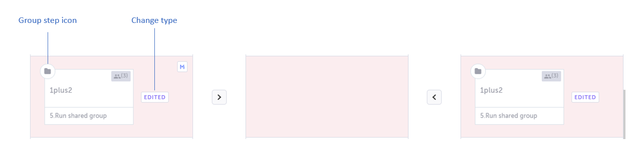 Target (left) – the shared step in the Target branch. If the shared step is a group, the group properties are displayed followed by all the steps within this group.