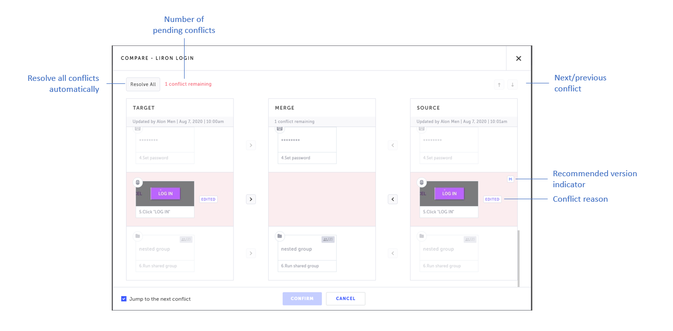 When done resolving all the conflicts in the test, click Confirm.