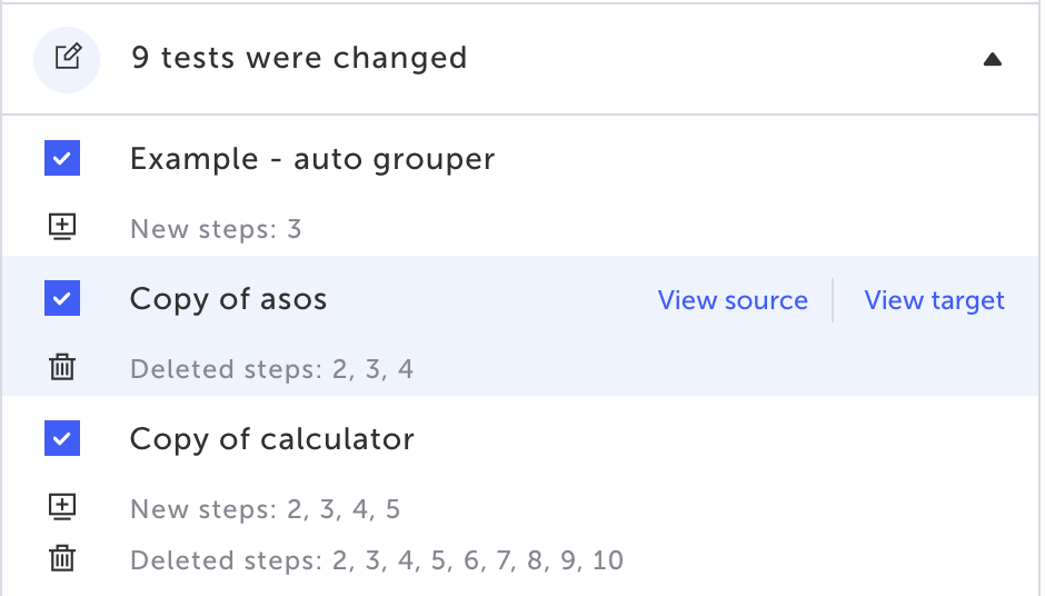 The list includes details of the differences between the source and the target branches (e.g. number of new steps, number of changed steps, or deleted steps.