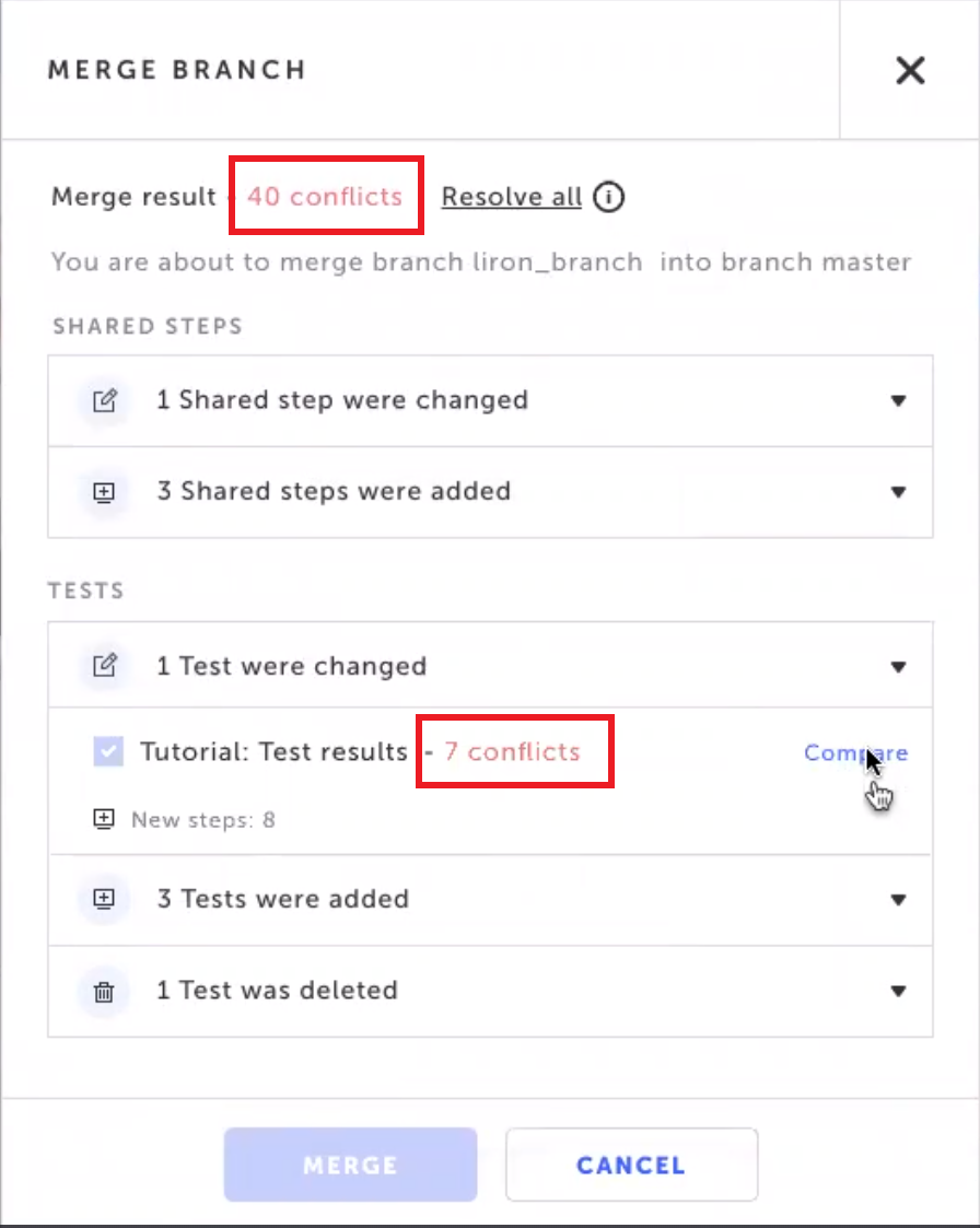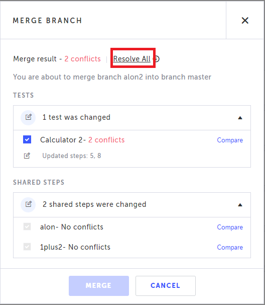 When merging two branches there can be conflicts between specific steps of a test and between shared steps. For example, a step that was changed in the source, but meanwhile was deleted in the target. You will not be able to proceed with the merge process before resolving all the conflicts.