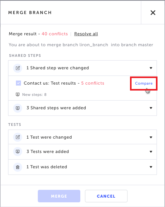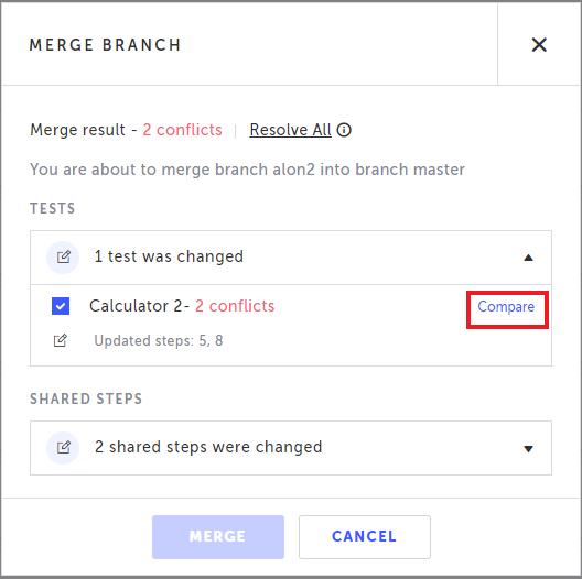 To resolve the conflict between shared steps, click Compare next to the shared step that includes conflicts: