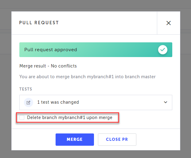 When merging the branches it is possible to automatically delete the source branch after the merge occurs. This can be done when merging following a pull request and also without a pull request. → To automatically delete the source branch: