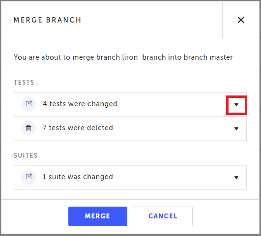 You can cherry-pick which tests and suites (i.e. merge items) you would like to include in the merge. By default, all items are selected. Unchecked items will not be included in merge, however, unless the source branch is deleted, they will be available for merging if you merge again. → To cherry-pick merge items: