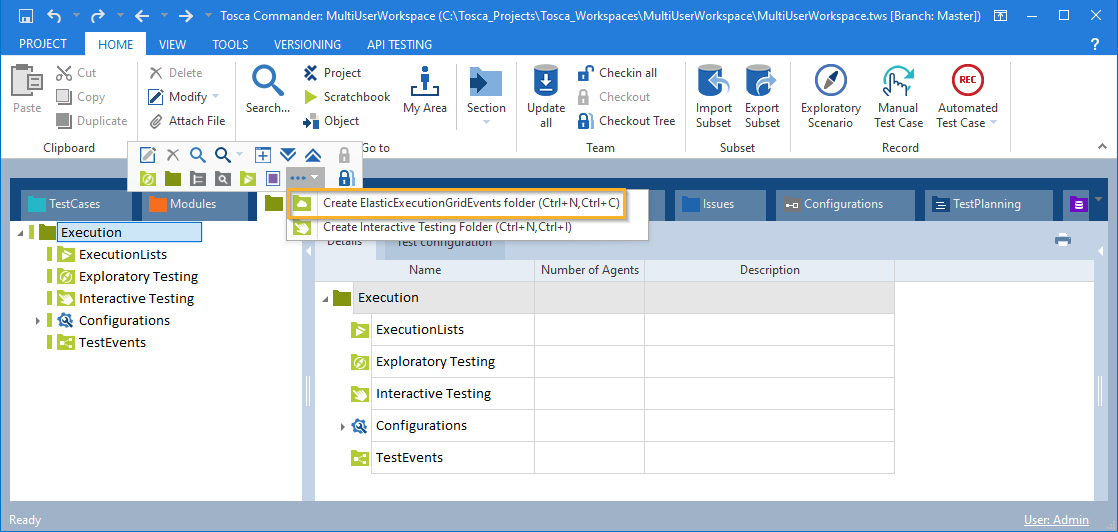 2. Erstellen Sie einen ElasticExecutionGridEvents-Ordner. Klicken Sie dazu mit der rechten Maustaste auf den Ordner Execution und wählen Sie Create ElasticExecutionGridEvents folder aus der Minisymbolleiste. Sie müssen dies nur einmal tun.