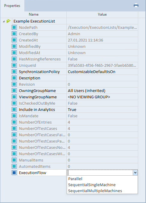 2. Wählen Sie im Bereich Properties der Ausführungsliste einen anderen Wert für ExecutionFlow aus.