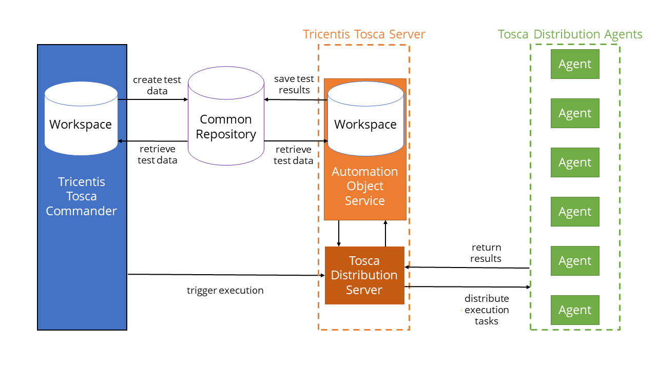 Dem Tosca Distribution Server, der den Automation Object Service (AOS) verwendet, um die Tests zu verwalten und auf die Agents zu verteilen, indem er seinen eigenen Arbeitsbereich verwendet. Der AOS-Arbeitsbereich ist mit einem Common Repository verbunden.