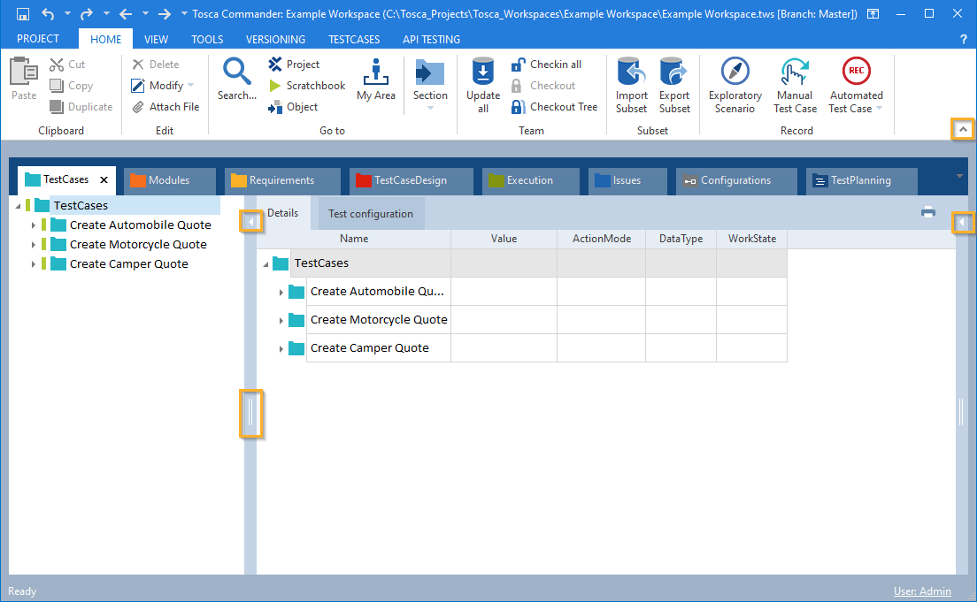 Tricentis Tosca bietet zwei Arten von Arbeitsbereichen: