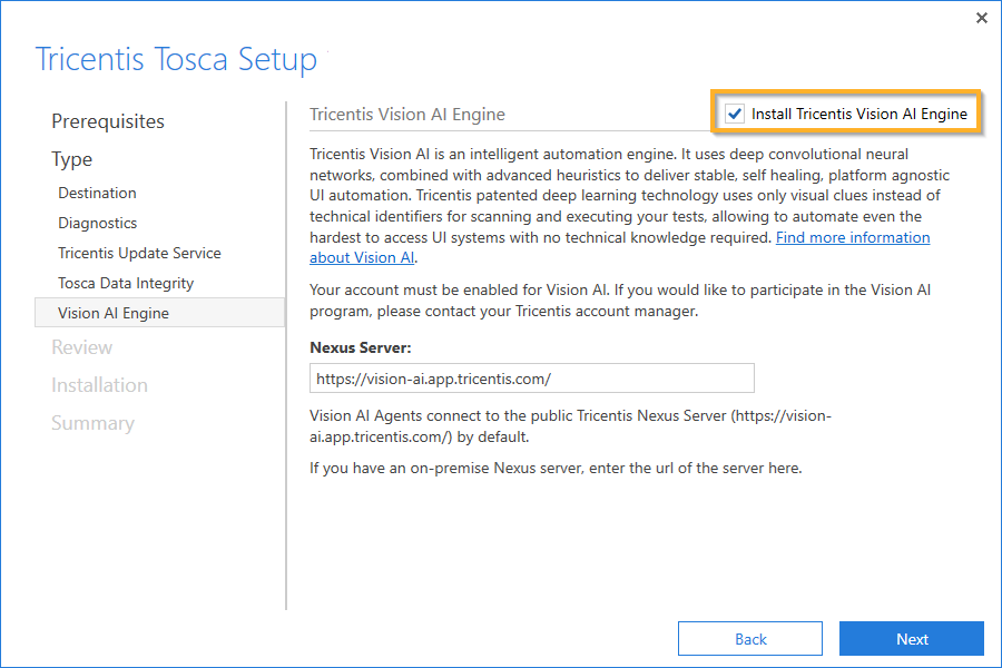 Vision AI wird standardmäßig installiert. Wenn Sie es nicht installieren möchten, deaktivieren Sie das Kontrollkästchen Install Tricentis Vision AI Engine.