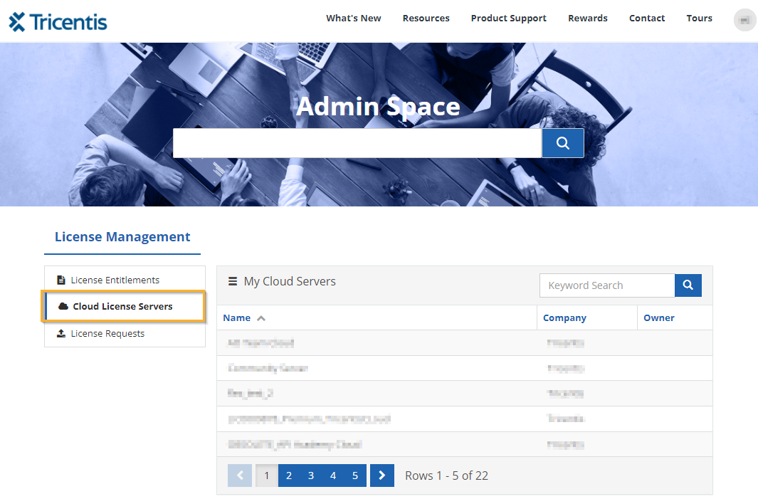 Öffnen Sie den Tricentis Support Hub und navigieren Sie zu Admin Space->Cloud License Servers.