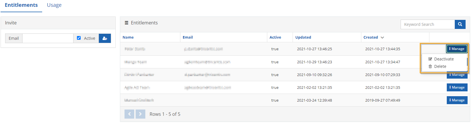 Um einen Benutzer zu deaktivieren, klicken Sie in der entsprechenden Zeile auf Manage und aktivieren Sie das Kontrollkästchen Deactivate.