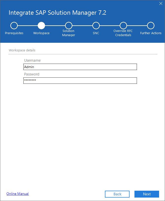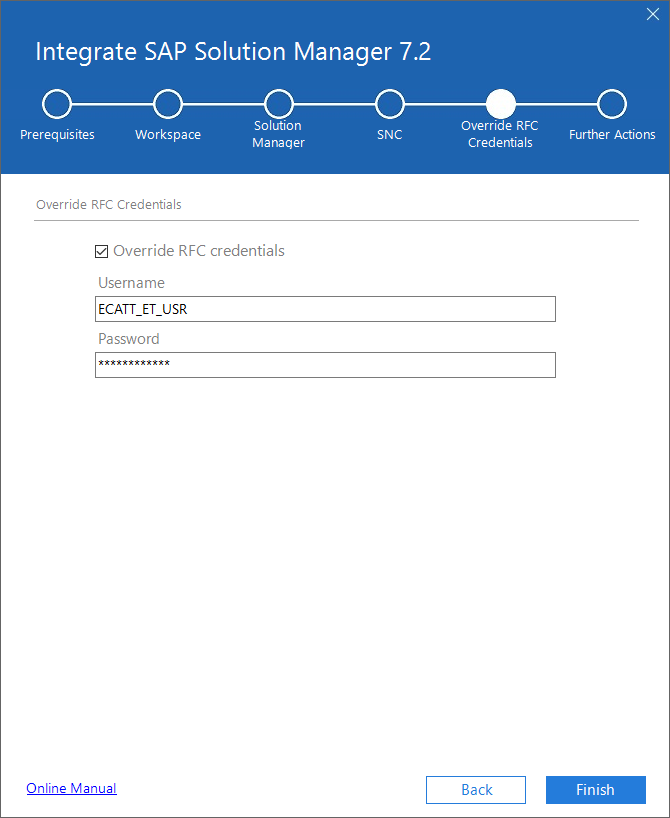 Sie können alternativ auch ein verschlüsseltes Passwort für den Benutzer erstellen, der sich mit SAP Solution Manager verbindet. Tricentis Tosca verwendet dann dieses Passwort, um sich mit SAP Solution Manager zu verbinden, anstelle des Passworts, das SAP standardmäßig verwendet.