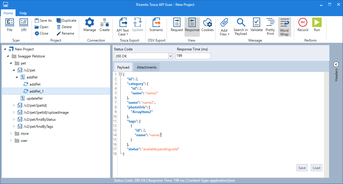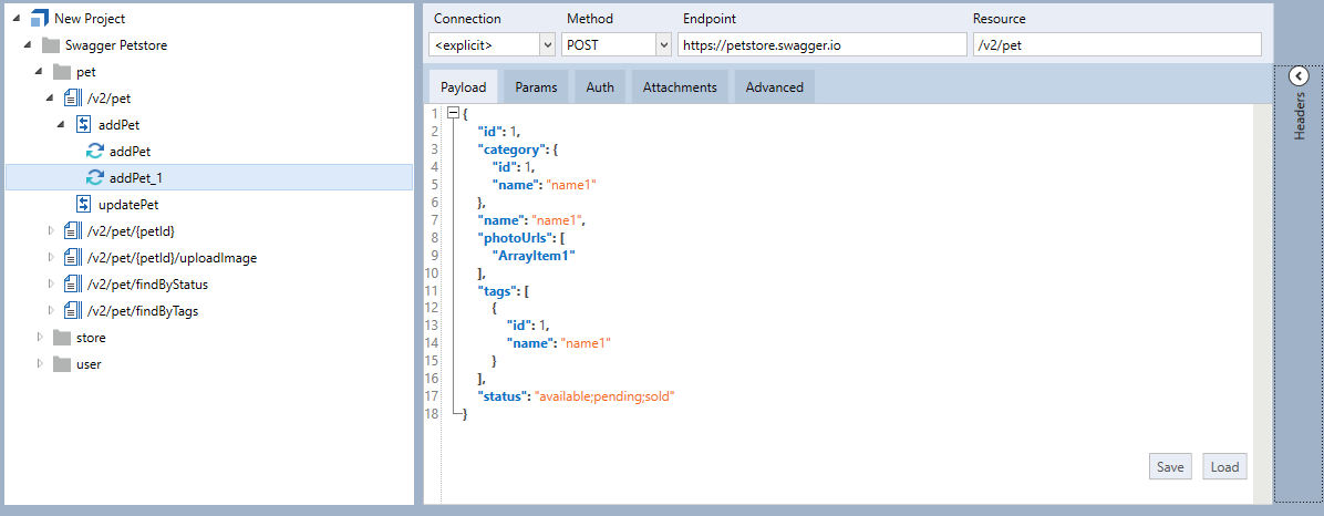 In diesem Beispiel wurde eine neue Nachricht mit der Option Create Message im Kontextmenü für den Vorgang addPet erstellt. Die Nachricht addPet_1 enthält dieselbe Payload wie addPet.