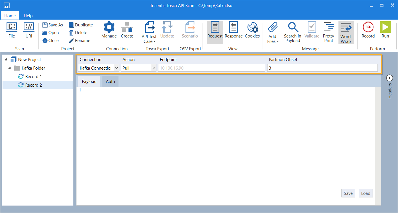Der Tricentis Tosca API Scan ermöglicht es Ihnen, Nachrichten über eine Apache-Kafka-Verbindung auszuführen. Ein Kafka-Thema speichert Datensätze, d. h. Nachrichten, die von einem oder mehreren Publishern gesendet und von einem oder mehreren Consumern gelesen werden. Dadurch können verschiedene Systeme unabhängig voneinander kommunizieren, z. B. wenn eines von ihnen offline ist. Darüber hinaus können Kafka-Themen in mehrere Partitionen unterteilt werden. Dies ermöglicht die Verteilung großer Datenmengen auf einen oder mehrere Server.