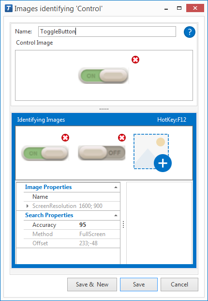In Tosca können auch mehrere Bilder für ein Control hinterlegt werden – beispielsweise wenn sich das Aussehen einer Umschaltfläche kontextbezogen ändert. Für die Identifikation muss eines der Bilder gefunden werden.