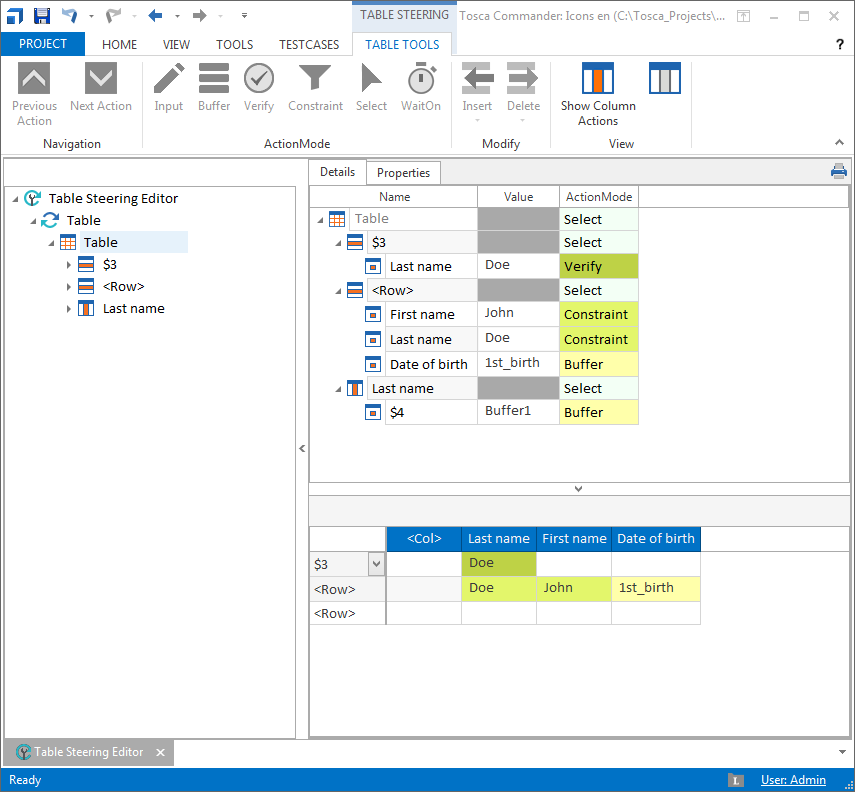 Diese Ansicht und das Menü Tabellenwerkzeuge stehen Ihnen in einem Testfall zur Verfügung, wenn Sie in der Baumansicht eine Tabelle, Zeile oder Spalte selektieren. Um eine Tabelle in der Baumansicht anzuzeigen, wählen Sie die Aktion Select für die Tabelle aus.