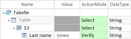 In einer Tabelle wird die Zeile 3 ausgewählt. In dieser Zeile wird überprüft, ob in der Spalte Last name der Wert Jones vorkommt.