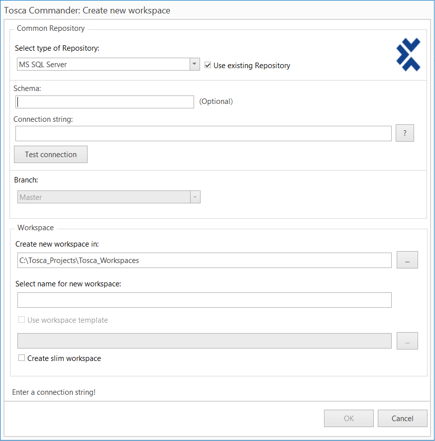 2. Nach einer Standardinstallation erstellt Tricentis Tosca neue Arbeitsbereiche im Standardverzeichnis C:\Tosca_Projects\Tosca_Workspaces. Sie können im Feld Create new workspace in ein anderes Verzeichnis angeben.